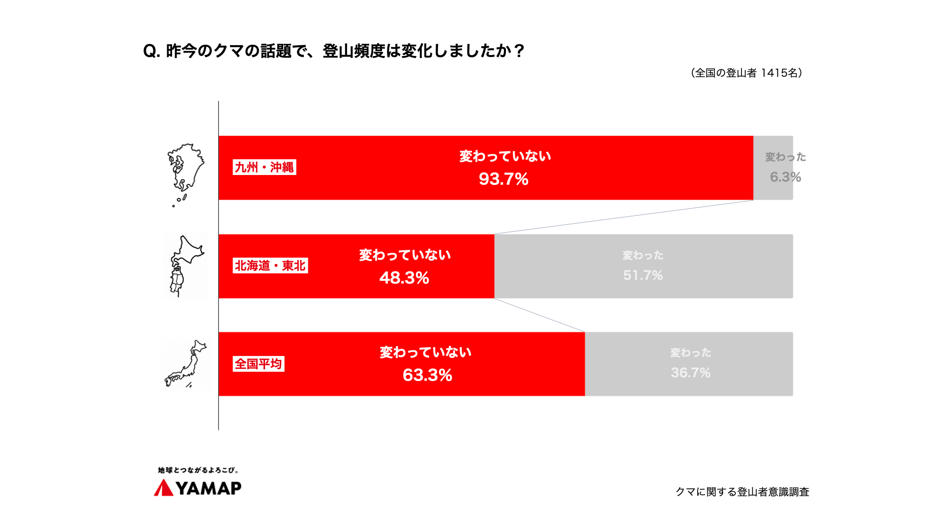「地球とつながるよろこび。」を企業理念に掲げアウトドア事業を行う株式会社ヤマップ(福岡市、代表取締役CEO 春山慶彦、以下ヤマップ)は、全国の登山者を対象に「クマに関する登山者意識調査」を実施しました。昨今、市街地での出没などクマに関する報道が過熱する中、実際に山という「現場」を知る登山者はどう感じ、どう行動しているのか。見えてきたのは、経験を積むほどに深まる野生動物への「畏敬の念」と「現実的な共存」を模索する成熟した姿でした。