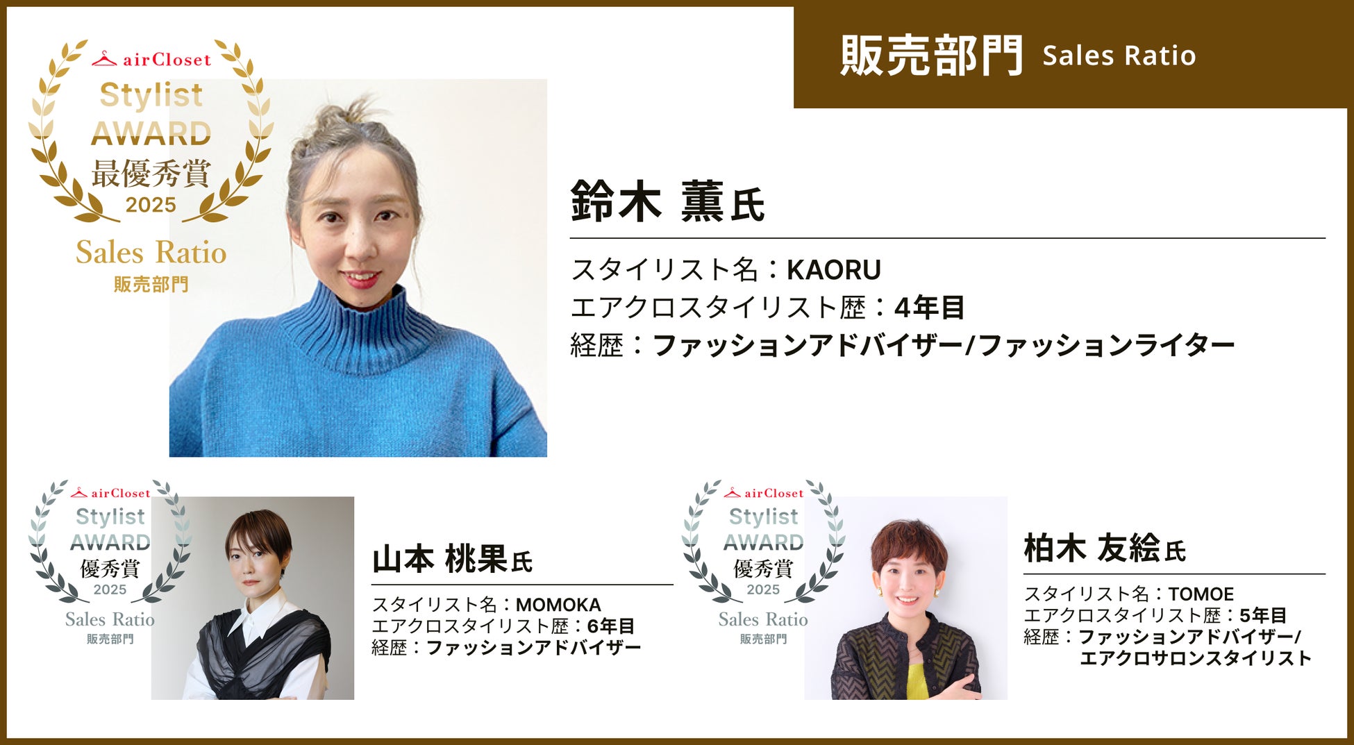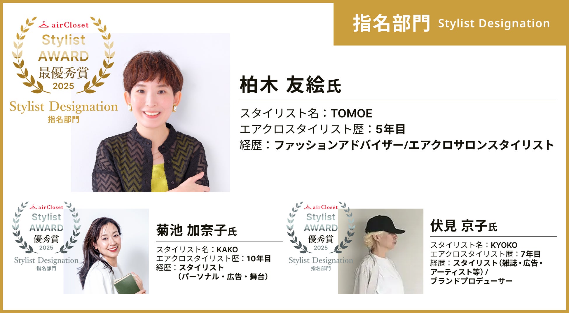 「airClosetスタイリストアワード2025」では、その提案力を可視化するため、お客様の評価、レンタル後の購入、スタイリスト指名といった行動データをもとに、年間を通じて特に高い支持を集めたスタイリストを選出しました。日々のスタイリングの積み重ねの中で信頼を獲得してきたスタイリストの取り組みを、レンタル・販売・指名の3部門で表彰しています。