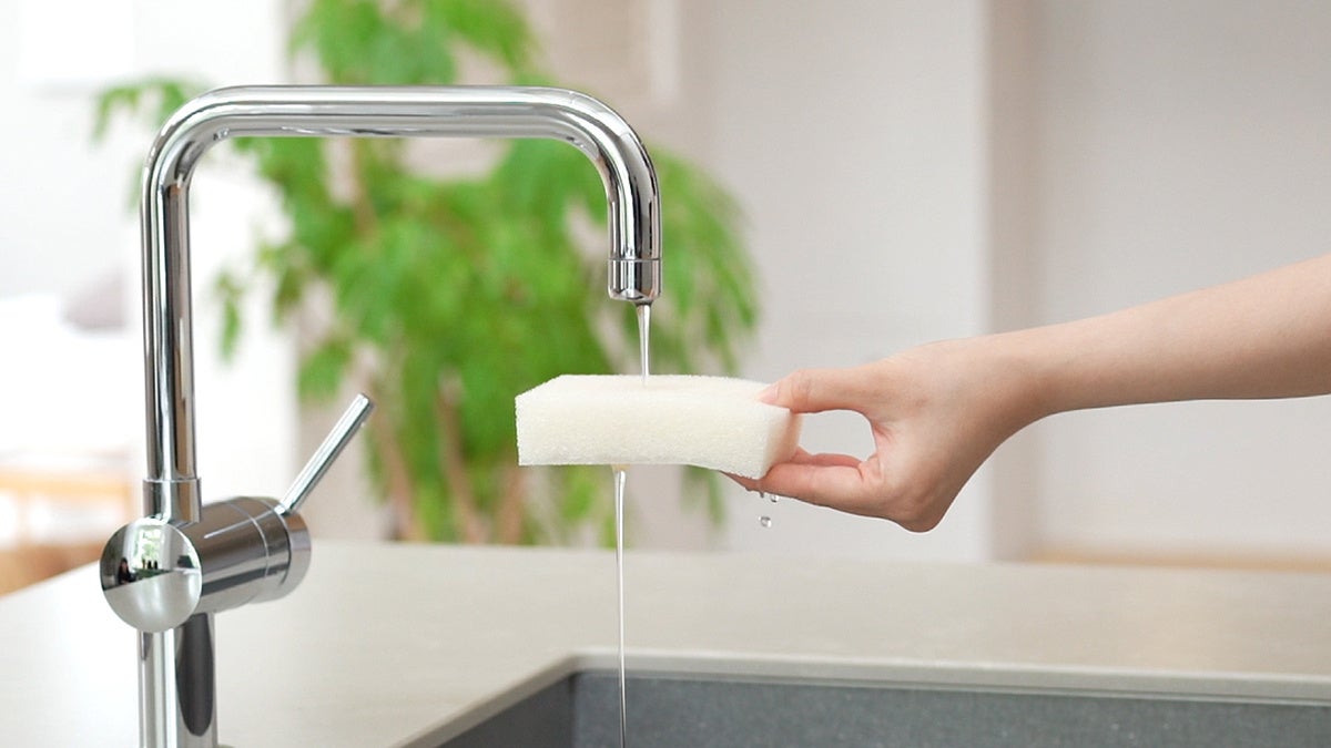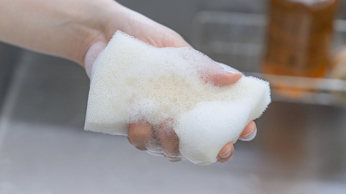 『サステナブル スポンジ』は、ヤシ由来の植物性素材を採用しながら、一般的な石油由来のスポンジと同等の耐久性や泡立ち、水切れのよさを備えたキッチン用クリーナーです。機能的な特徴としては、ウレタンの目が細かく繊細な泡が作り出されること。そして、抗菌剤を配合し、水や空気の通り道を邪魔する膜を除膜加工で取り除くことで、高い通気性も実現し、スポンジ自体の清潔も保ちます。耐久性も高く、コンパクトで持ちやすいサイズです。
