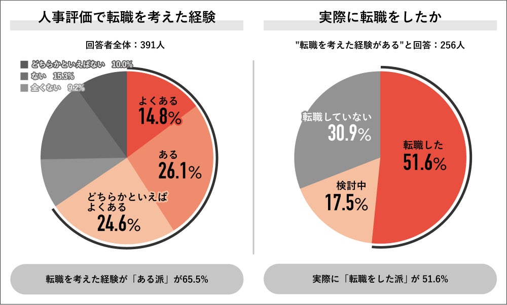 ・全体の65.5%が人事評価で転職検討経験あり うち51.6%が実際に「転職した」と回答