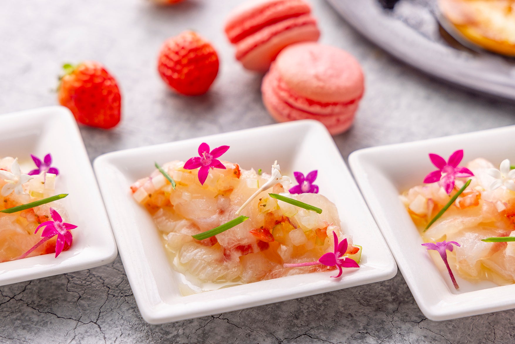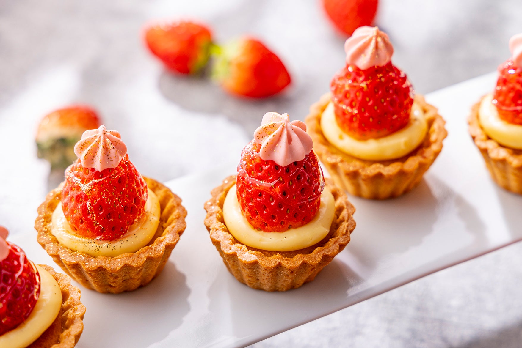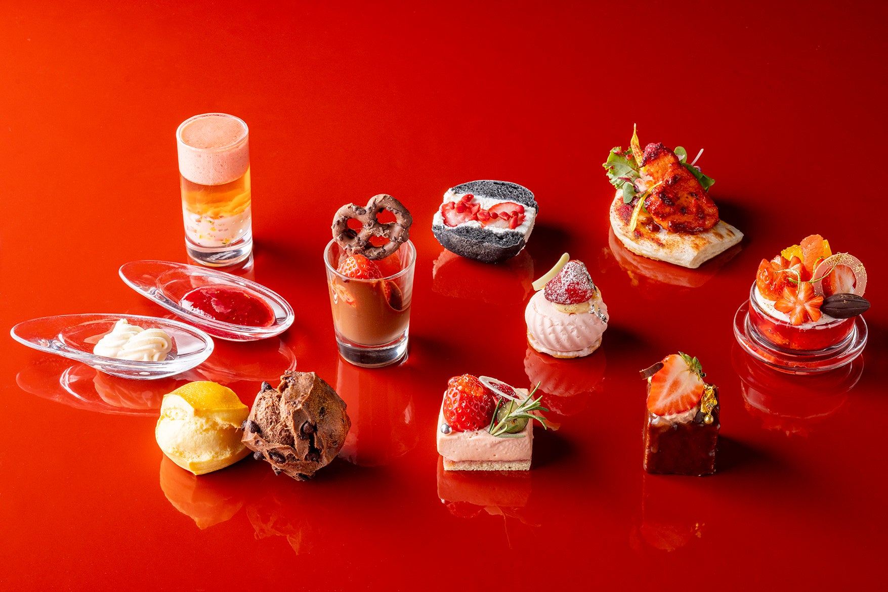 バラが華やかに香るいちごのプリン、フレッシュいちご&とろとろのディップチョコレート、いちごとチョコレートのムースケーキなど絶妙なバランスで仕上げた見た目にも可愛らしいスイーツばかり。セイボリーのセビーチェやバーガーも、いちごのアクセントが効いた、驚きのある味わいをお愉しみいただけます。