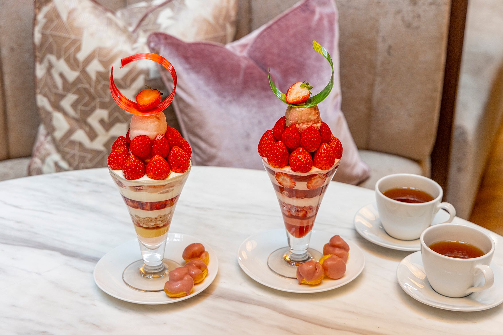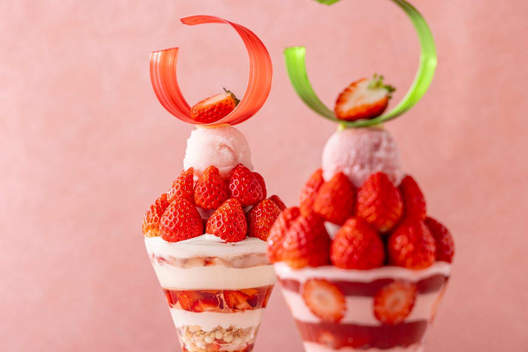 旬のフルーツを贅沢に愉しむ、冬に食べたいご褒美パフェ。真っ赤ないちごを贅沢に味わいつくす2種のストリングス・パフェは、たっぷりのフレッシュいちごを使い「いちごローズ」と「いちごシャンパン」の異なる味わいに仕上げました。