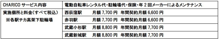 株式会社ジェイアール東日本都市開発では、子育て世代を応援するサブスクサービスとして、専用駐輪場付きの子供乗せ電動自転車の定額レンタルサービス「CHARICO(チャリコ)」を今春より開始します。CHARICO(チャリコ)は、子育て世代の必需品・子供乗せ電動自転車を定額でレンタルするサービスに加え、駅チカ専用駐輪場をセットでご用意したサブスクサービスです。料金(税込)は月額7,700円~で、年間契約するとお得な月額6,600円~に。安心してご利用いただくために保険に加入し年間2回自転車メーカーによるメンテナンスも実施します。サービス開始は2022年4月1日から。申し込みは3月21日から専用サイトで受付を開始します。サービス実施個所は、東京都内の西荻窪駅と赤羽駅、神奈川県内の武蔵小杉駅と武蔵新城駅近くの高架下駐輪場で、各箇所30台ご用意いたしました。