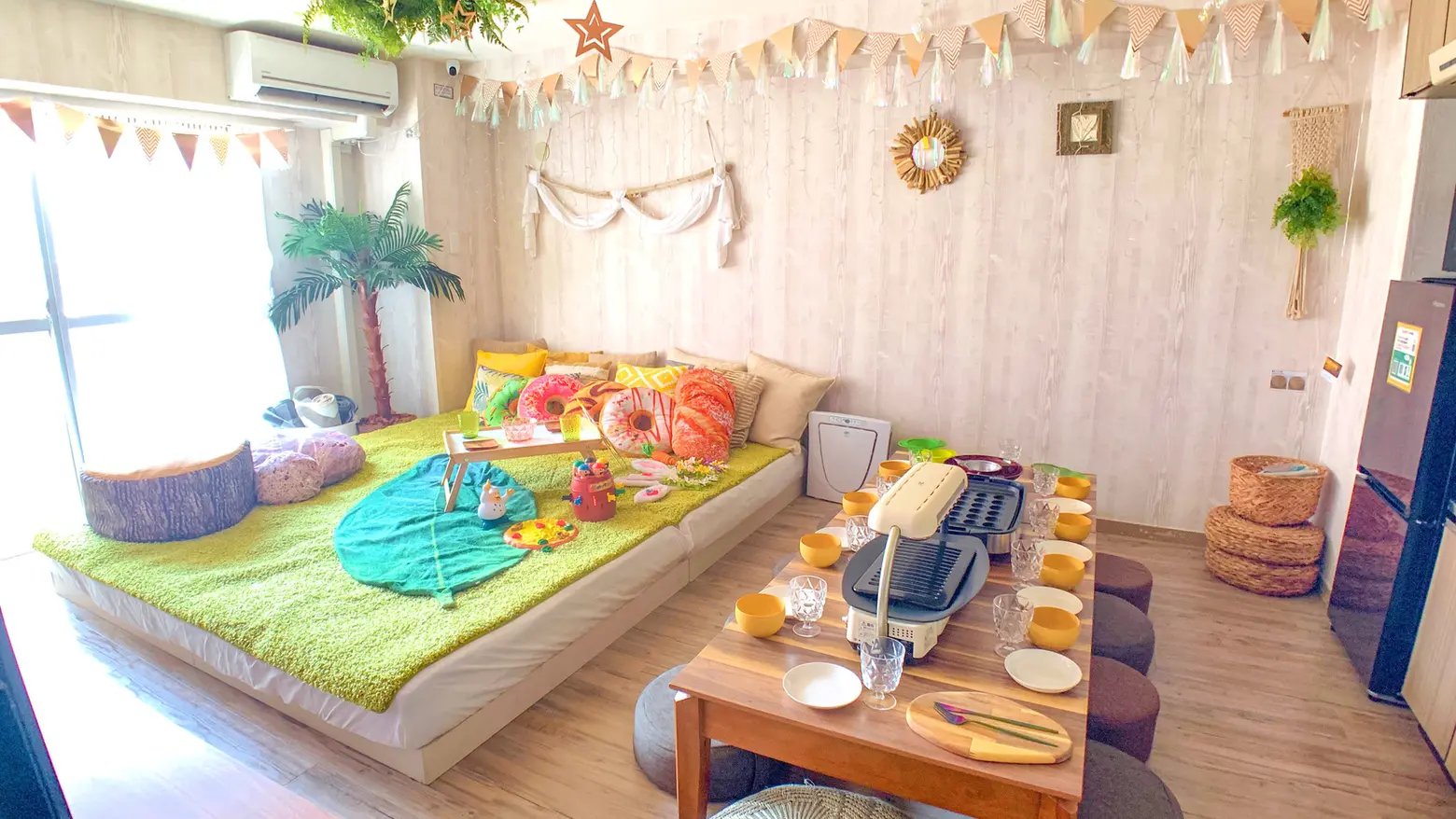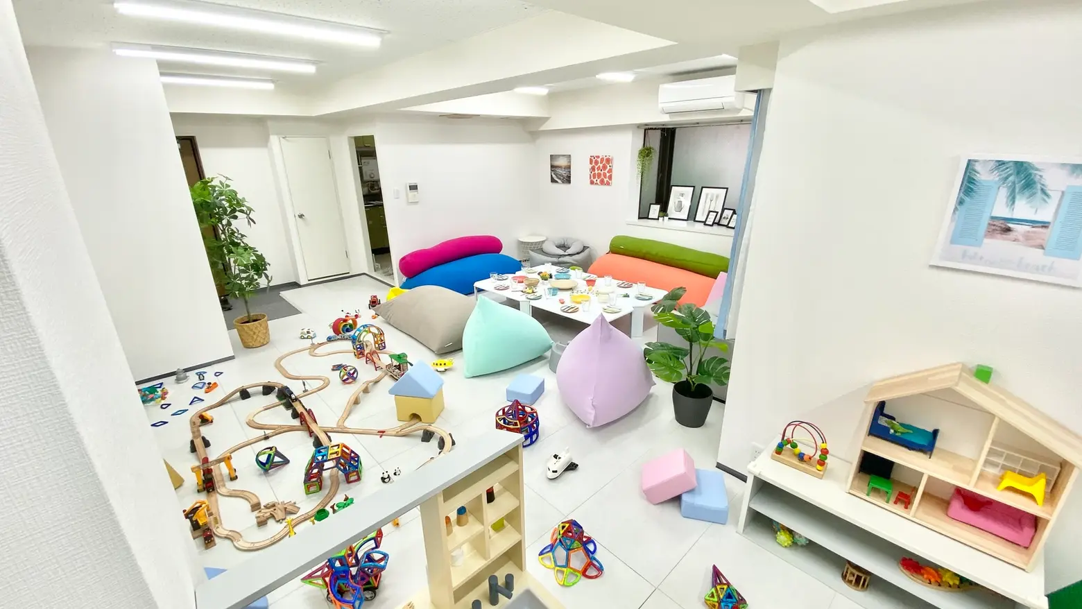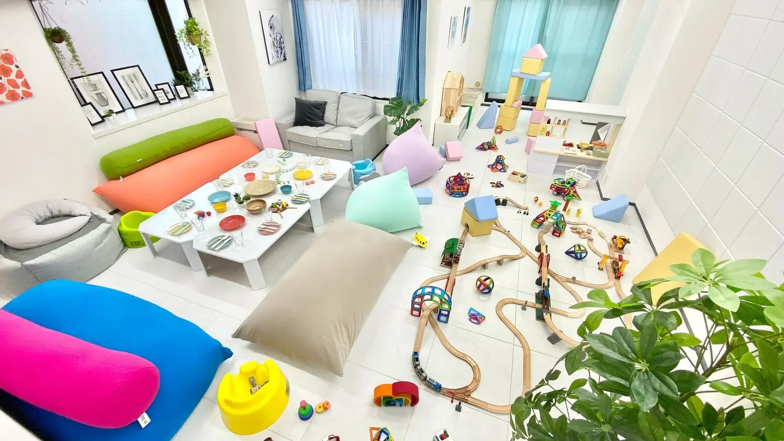 知育玩具と巨大クッション!38平米の広々スペースで複数家族でも安心
