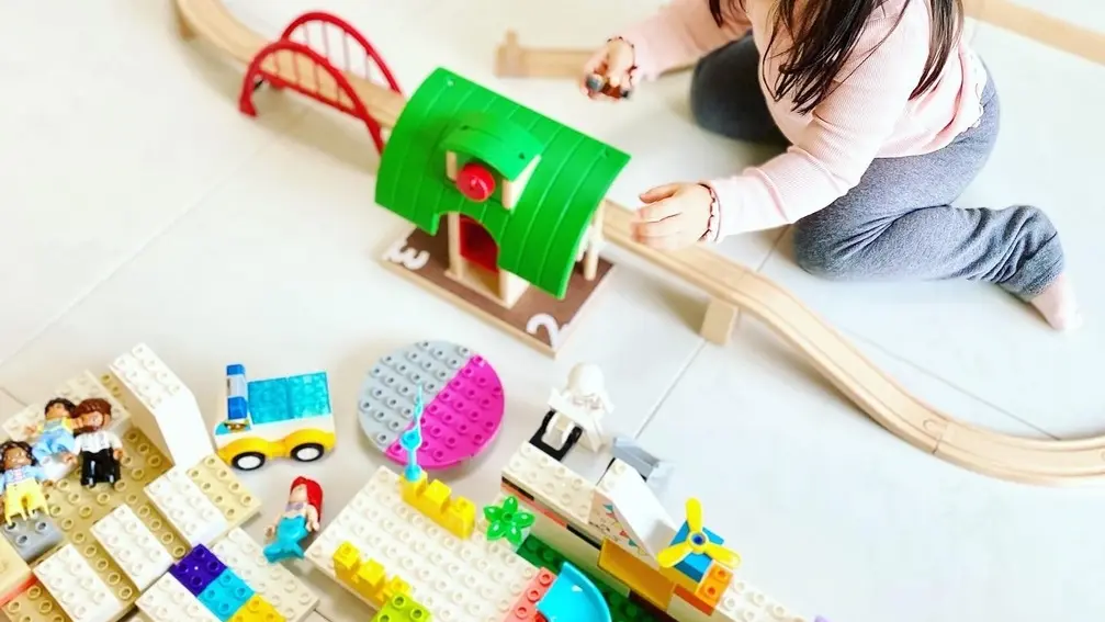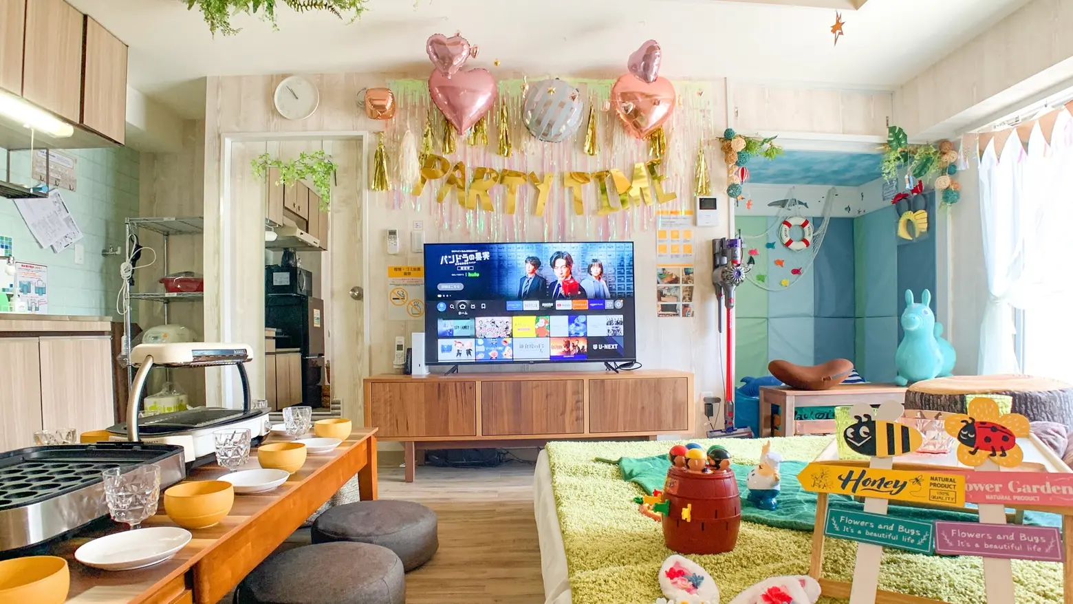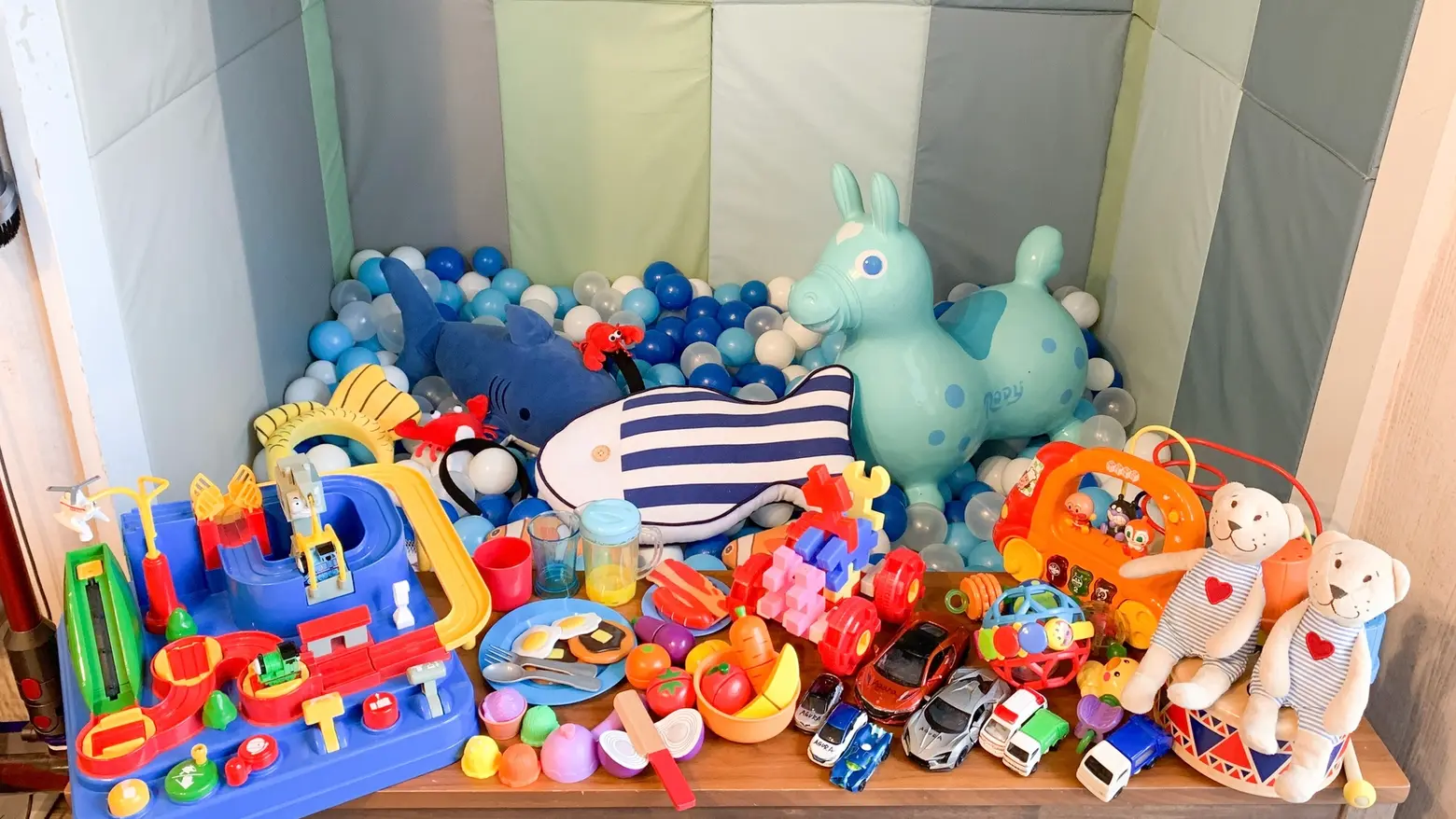 知育玩具と巨大クッション!38平米の広々スペースで複数家族でも安心