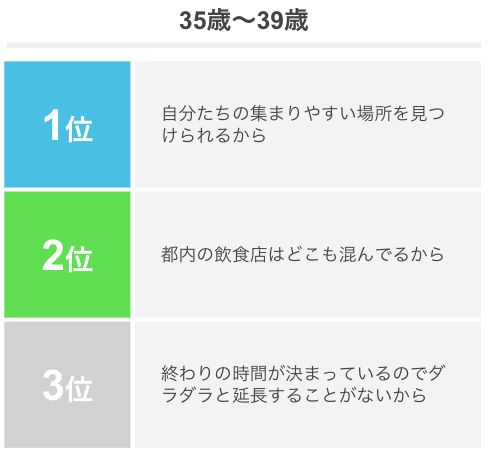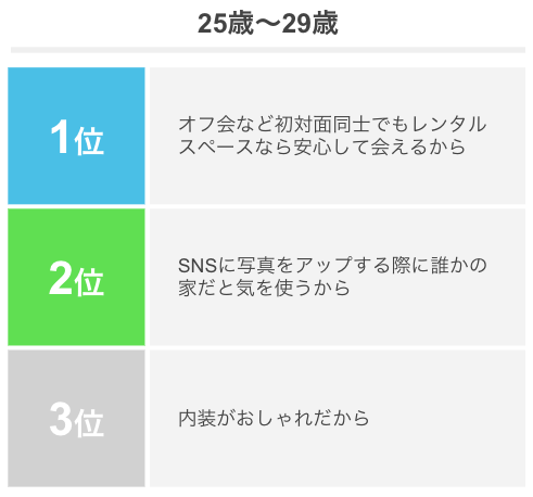 さらに、年齢別でレンタルスペースを選んだ理由の違いが見られました。25歳〜29歳の1位は「オフ会など初対面同士でもレンタルスペースなら安心して会えるから」、2位に「SNSに写真をアップする際に誰かの家だと気を使うから」など、初対面でも気を使わなくて良いことや、気軽にSNS投稿できるかどうかを重視。一方、30歳〜34歳の1位は「終わりの時間が決まっているのでダラダラと延長することがないから」と、自宅と異なり、終わりの時間が決まっていることにメリットを感じている人が多いことが分かりました。また、35歳〜39歳では、「自分たちの集まりやすい場所を見つけられるから」が1位になるなど、利便性を優先する人が多い結果となりました。