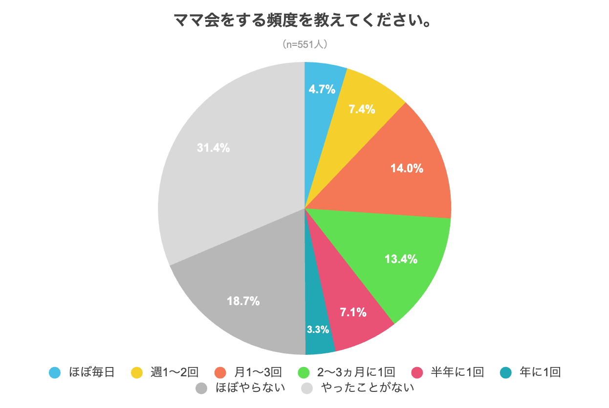 子育てママ551人に対し「ママ会をする頻度」について質問したところ、約2人に1人の49.9%が「年に一回以上したことある」と回答。そのうち月1〜3回の頻度で開催している人が一番多いことがわかりました。
