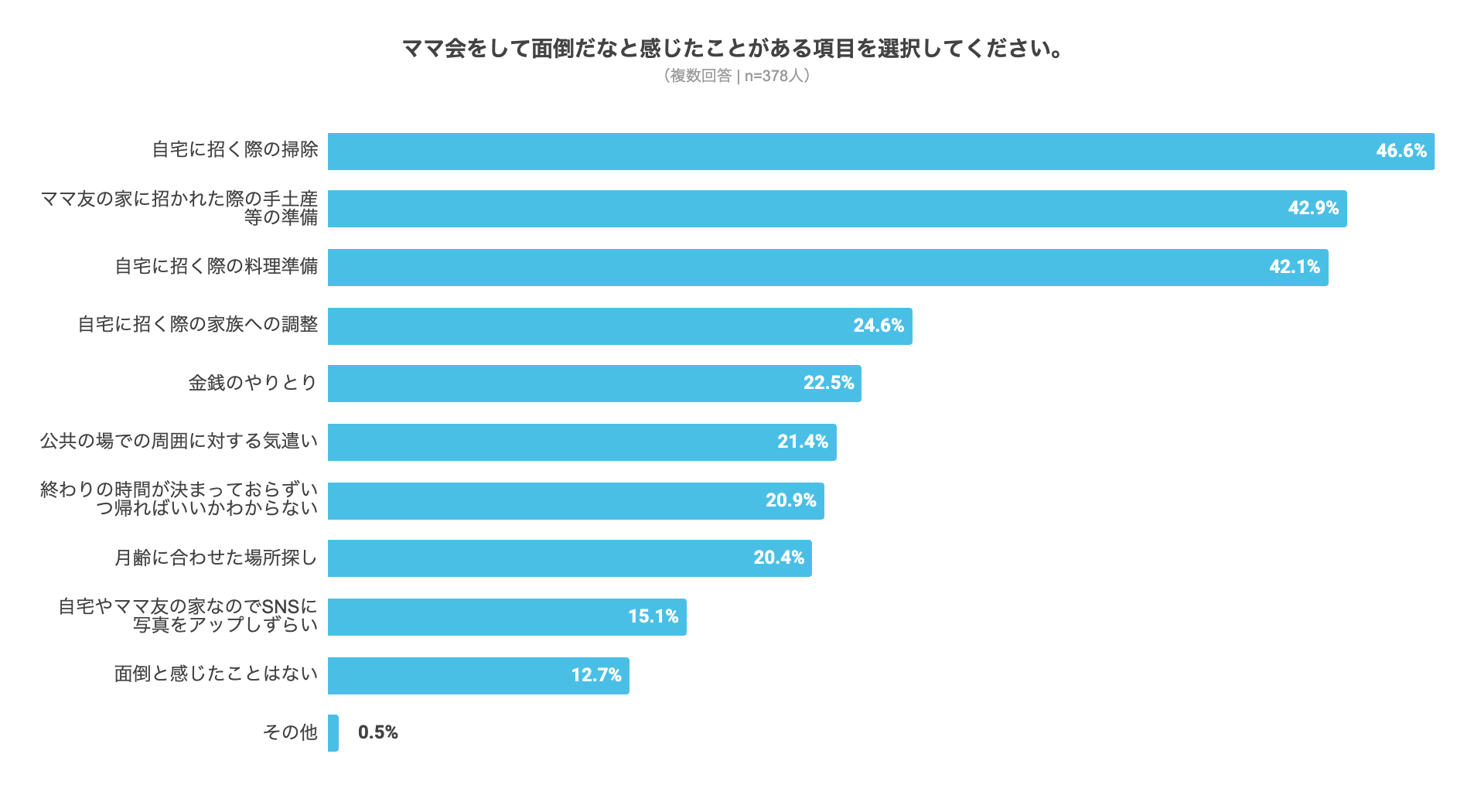 「ママ会をして面倒と感じたことがある人」は87.3%と9割近くに。「面倒と感じた項目(複数回答可)」について質問すると、1位「自宅に招く際の掃除」、2位「ママ友の家に招かれた際の手土産等の準備」、3位「自宅に招く際の料理準備」という結果になりました。「自宅」と「ママ友の家」はママ会開催場所の2位と3位である一方、準備に手間がかかることに面倒と感じている子育てママが多いことがわかりました。