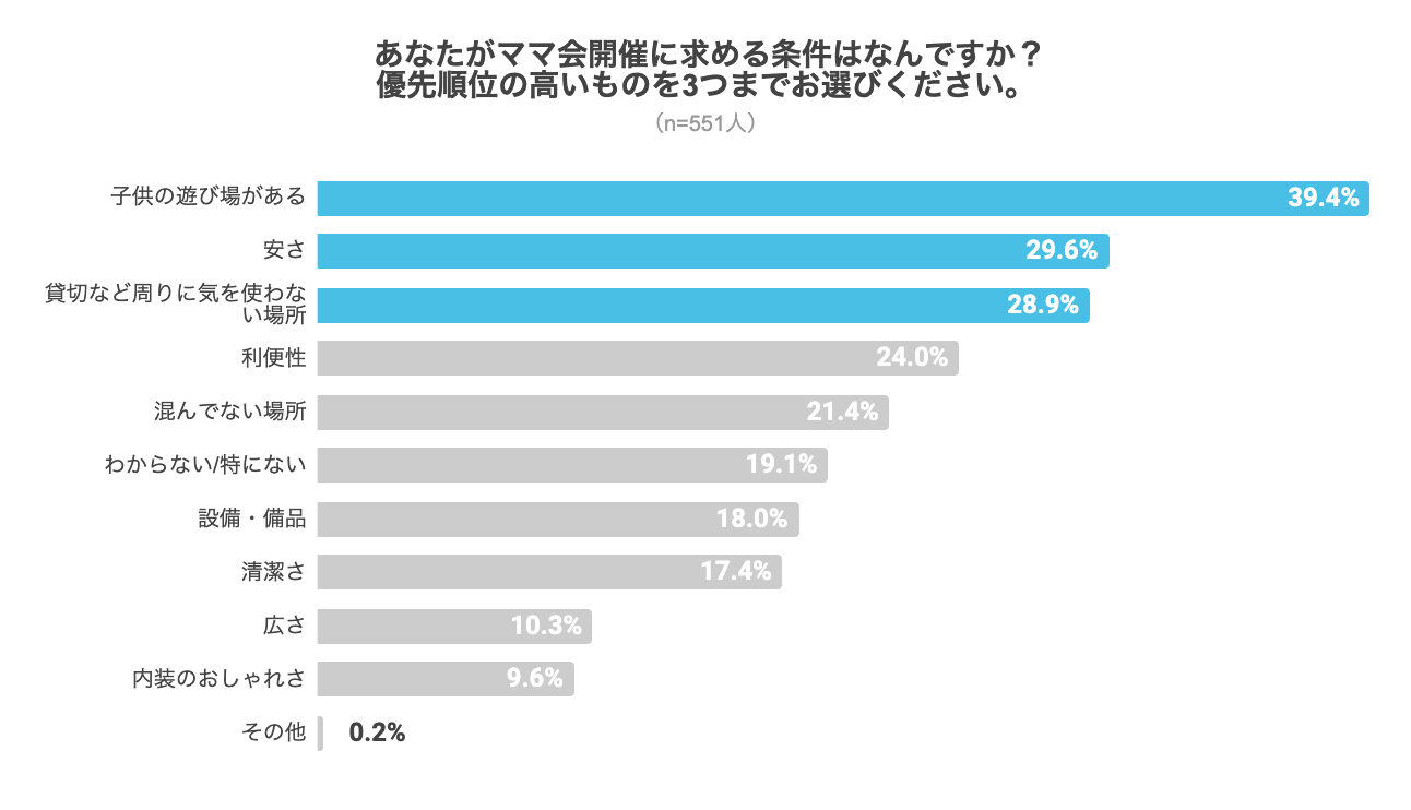 ママ会をしたことがある子育てママに「ママ会の場所を決めるにあたって重視するポイント(複数回答可)」を聞いたところ、「子供の遊び場の有無」39.4%、「安さ」29.6%、「貸切など周りに気を使わない」が28.9%でした。