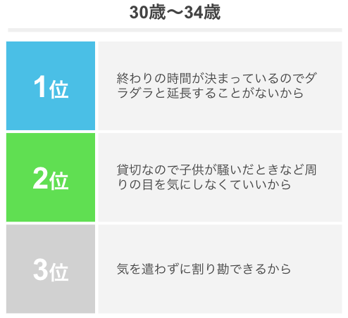 レンタルスペースでのママ会を選んだ理由TOP3、1位「貸切なので周りの目を気にしなくていいから」、2位「気を使わずに割り勘できるから」、3位「自宅に呼ぶ際の掃除や料理などの準備がいらないから」