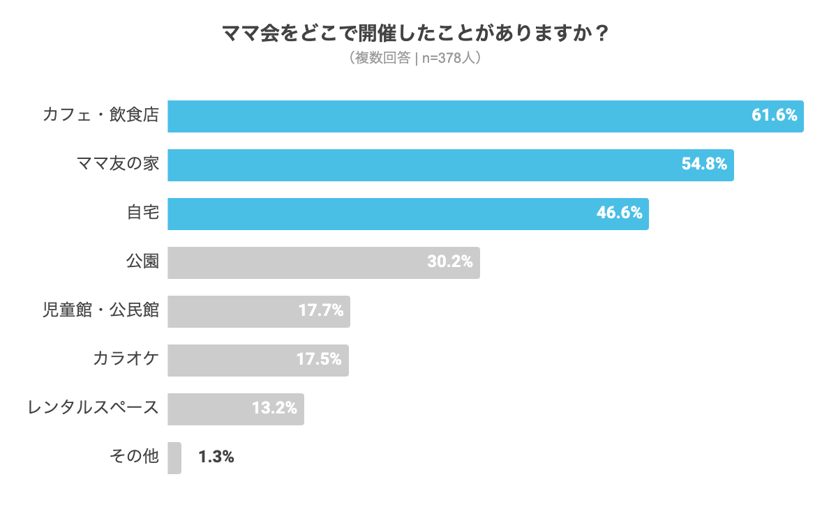 ママ会をしたことある子育てママの中から「ママ会を開催した場所(複数回答可)」を質問したところ、もっとも多かったのが「カフェ・飲食店」61.6%、次いで「ママ友の家」54.8%、「自宅」46.6%となりました。