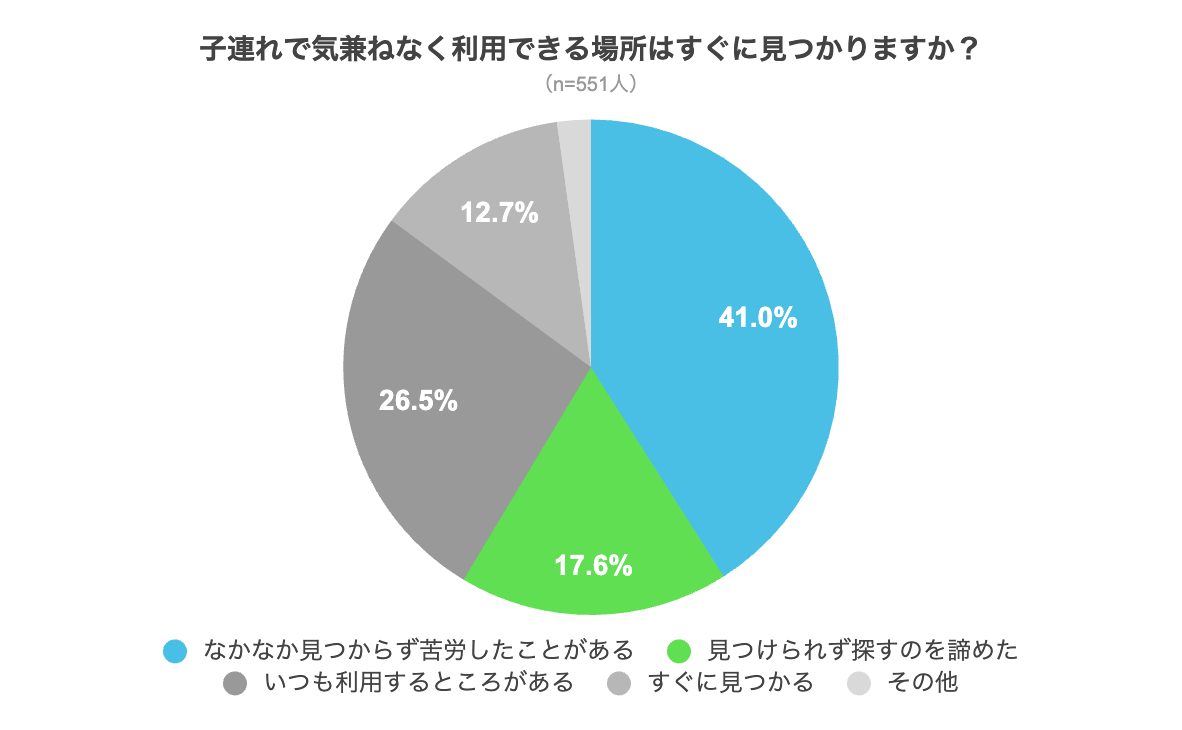 子育てママの59%が、子連れでも気兼ねなく利用できる場所を探すのに「なかなか見つからず苦労したことがある」か「見つけられずに探すのを諦めたことがある」と回答。