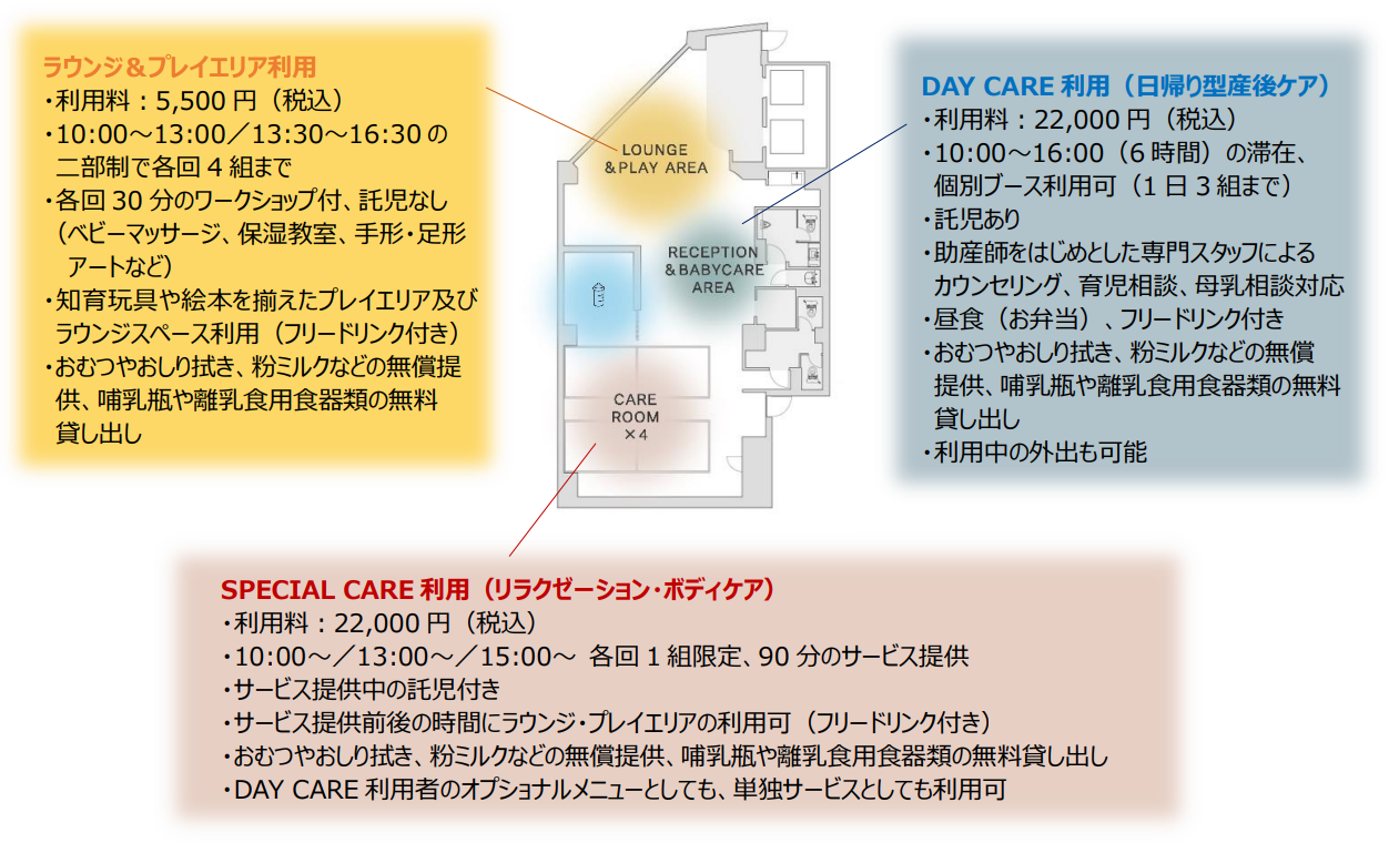 本施設では、助産師をはじめとする専門スタッフがママと赤ちゃんのケアを行うほか、託児付きのボディトリートメント、離乳食や、職場復帰を見据えた“母乳育児と仕事の両立”に関する相談などにも対応。知育玩具や絵本を揃えたプレイエリア・フリードリンク付きラウンジスペースの時間帯利用など、日帰りで気軽に利用できるサービスを提供予定です。