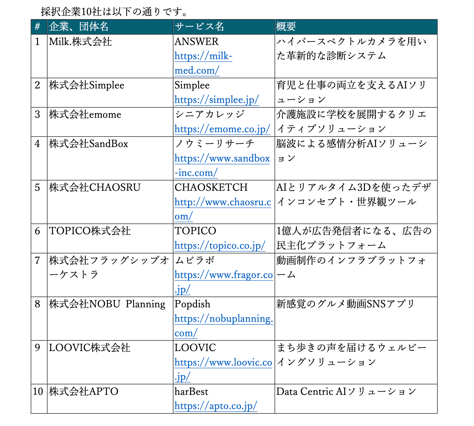 採択企業10社は以下の通りです。