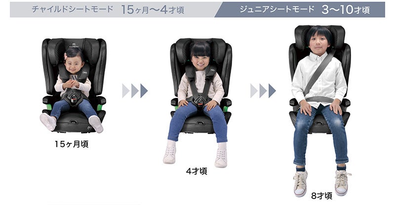お子様の成長に合わせて「チャイルドシートモード」から「ジュニアシートモード」に変更できます。ヘッドレストはワンタッチで7段階に高さ調節可能。座面はワイド設計のため、大きくなっても広々と座ることができます。