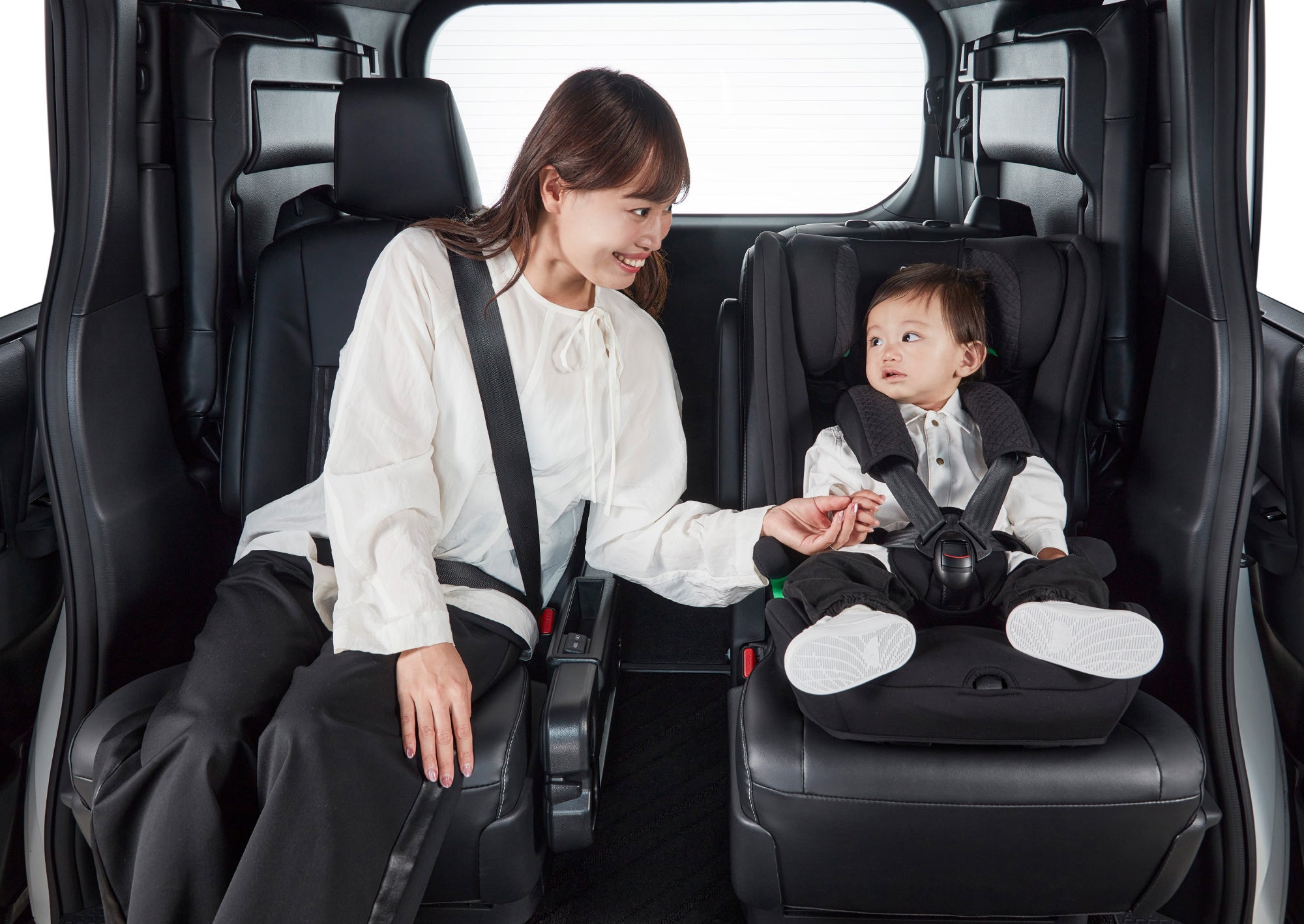 製品幅440mmの省スペース設計。軽自動車やコンパクトカーでも、お子様と並んだ状態で広々と乗車できます。