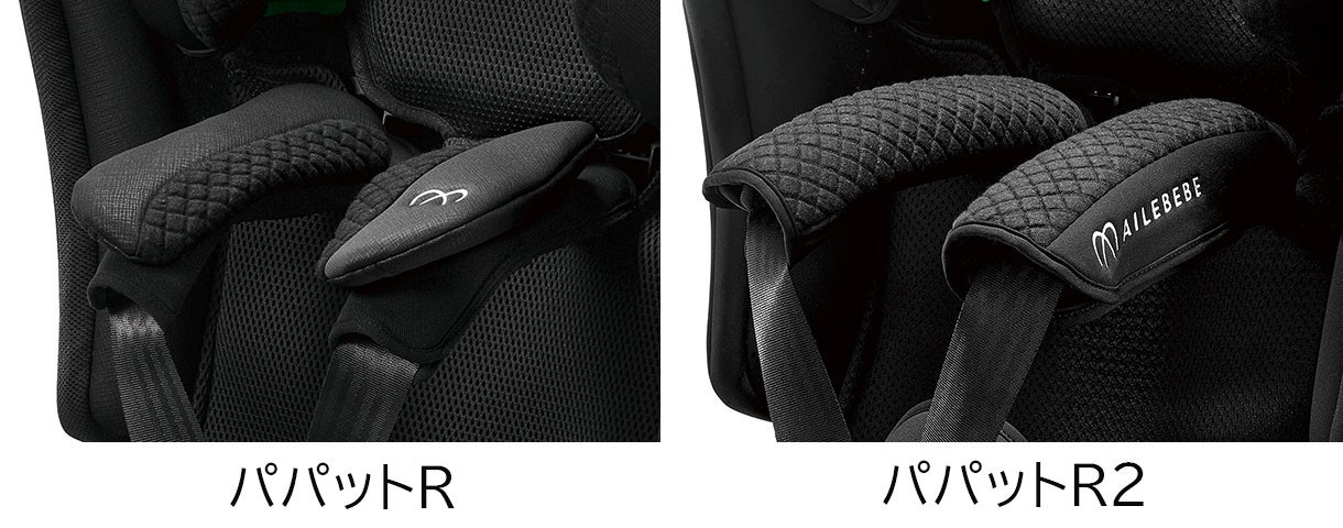 株式会社カーメイト(本社:東京都豊島区)は、ベビー用品ブランド「AILEBEBE(エールベベ)」より、スムーズな乗せ降ろしを追求したチャイルド&ジュニアシート「エールベベ・パパット」シリーズから、新モデル「エールべべ・パパットR2」を2025年12月5日(金)に発売いたしました。本製品は、従来モデルより肩ベルトを最大約20cm長くすることで、お子様の腕を通す空間が広くなり、乗せ降ろしがしやすくなりました(上写真)。また、お子様の頬や首にフィットする“ふわピタ肩パッド”で快適さも向上。その他の進化した特長や詳細は以下をご覧ください。