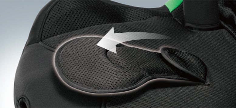 チャイルドシート「クルットR」シリーズで採用実績のある、股ベルト(バックル部)が前傾を維持する縫製カバーを採用。バックルがお尻の下敷きになる煩わしさがなくなり、お子様をより乗せやすくなります。