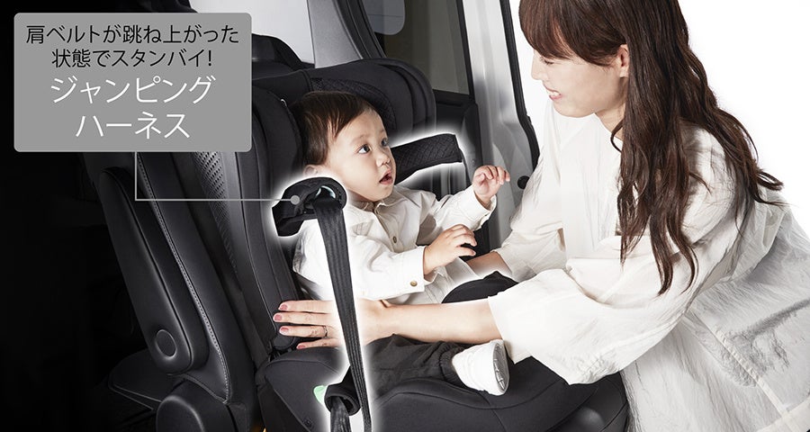 肩ベルトが跳ね上がった状態をキープする「ジャンピングハーネス」搭載で、お子様の腕を通しやすい。お子様が成長しジャンプ機能が不要になった際には、ハーネスを背もたれ部に簡単に収納することが可能(特許第6966891号)です。また座面は、パパママが乗せやすく、お子様が1人でも乗り込みやすい高さに設計することで乗り降りをサポートします。
