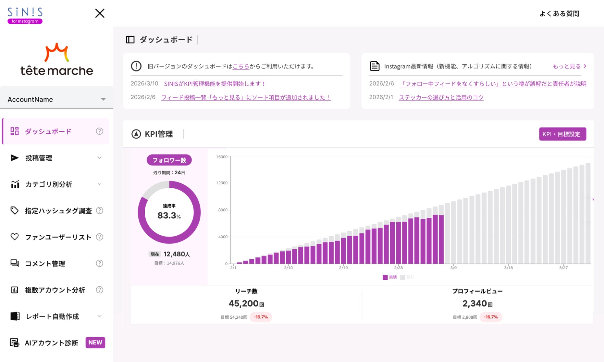企業向けSNSマーケティング支援を中心としたビジネス展開をする株式会社テテマーチ(本社:東京都目黒区、代表取締役:上田大介)は、企業のSNSマーケティングにおけるデータ分析から運用までを支援するツール「SINIS for Instagram(以下、SINIS)」において、「KPI管理機能」を2026年3月より提供開始いたします。