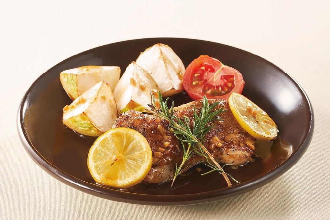 旬の国産かぶが主役のひと皿。食欲をそそる醤油ガーリックソースにローズマリーがほどよく香るレモン風味のチキンソテーと、かぶの甘さがよく合います。