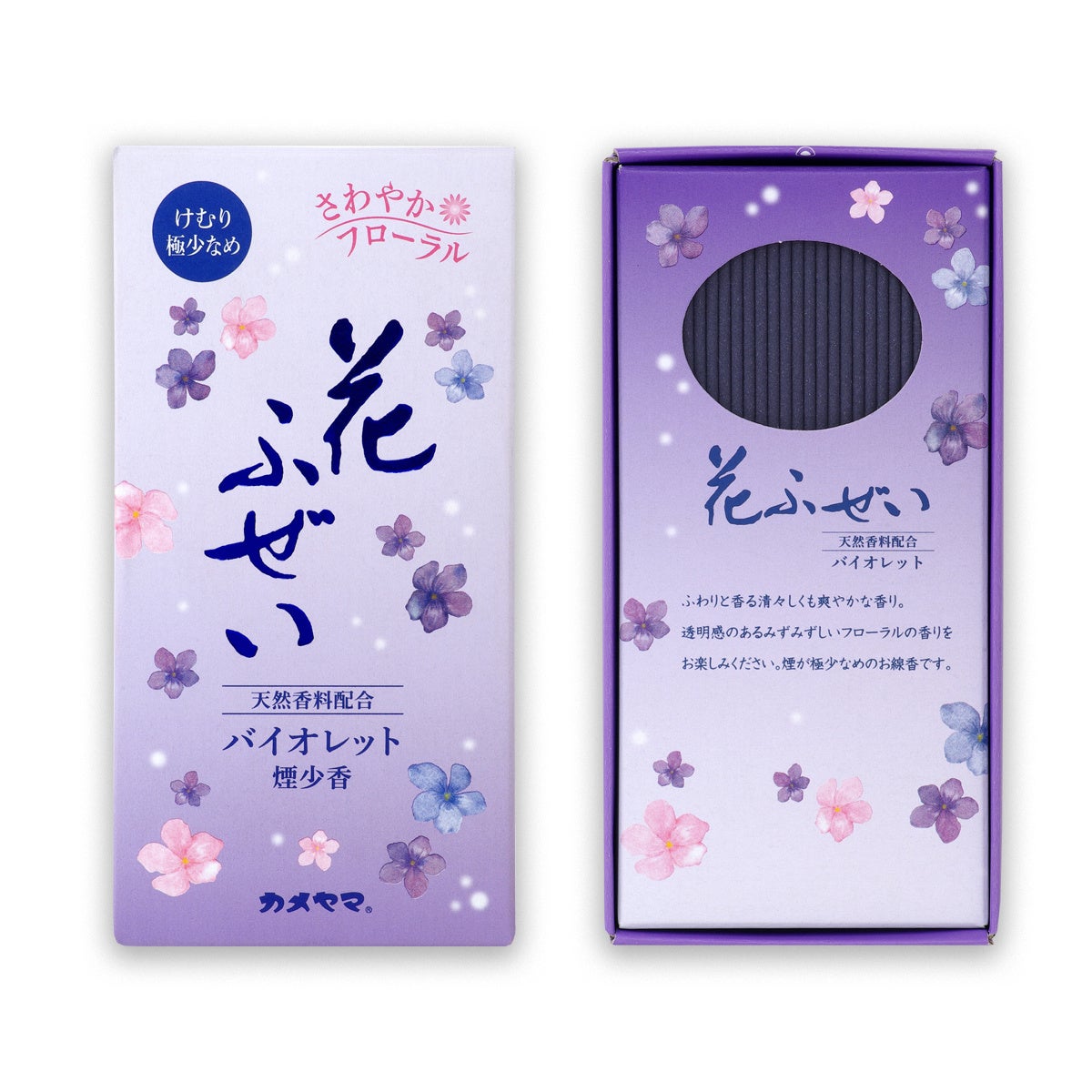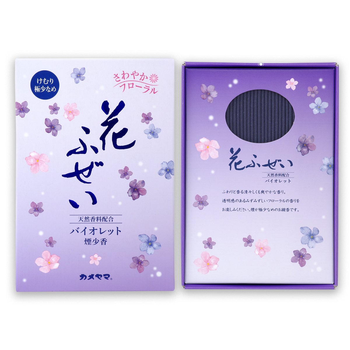『花ふぜいバイオレット』は、ふわりと香る清々しくも爽やかな香り。透明感のあるみずみずしいフローラルの香りをお楽しみください。天然香料配合の煙の極少なめのお線香。