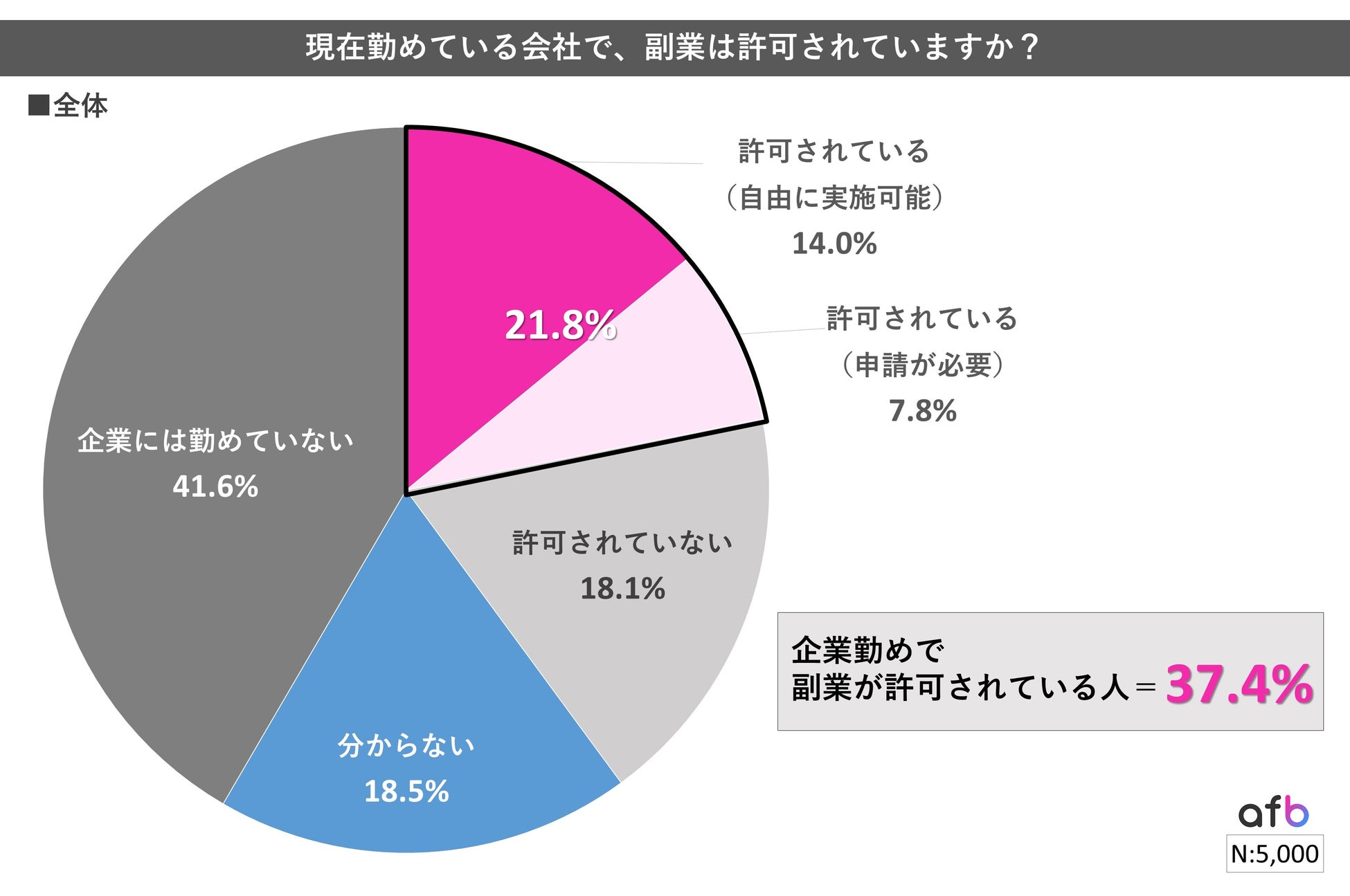 41.6%は「企業に勤めていない」という回答だったため、その回答者を除いた、”企業勤めで副業が許可されている人”は37.4%という結果になりました。