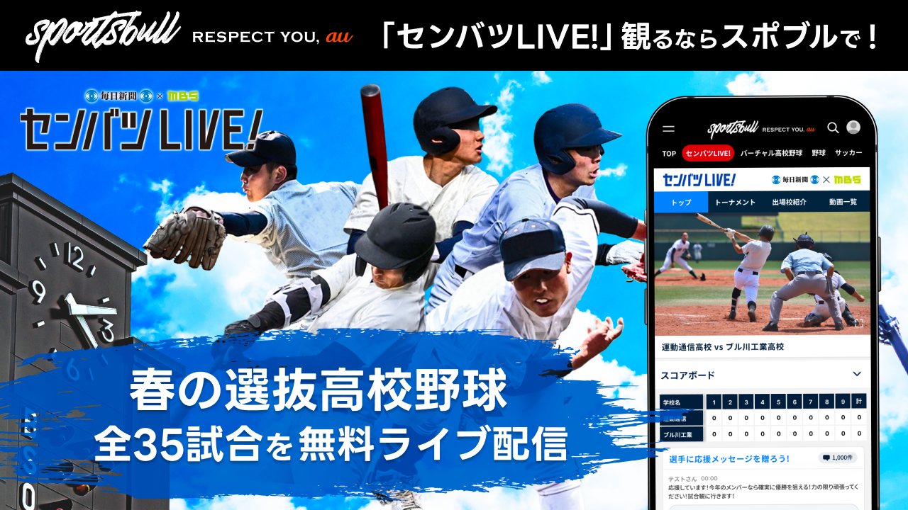 株式会社毎日新聞社(本社:東京都千代田区、代表取締役社長:松木健、以下、毎日新聞)と株式会社毎日放送(本社:大阪府大阪市北区、代表取締役社長:虫明洋一、以下、MBS)、株式会社運動通信社(本社:東京都港区、代表取締役社長:黒飛功二朗、以下、運動通信社)は共同で、KDDI株式会社(本社:東京都千代田区、代表取締役社長:髙橋誠、以下、KDDI)の協力のもと、運動通信社が運営するインターネットスポーツメディア「SPORTS BULL(スポーツブル)」で展開する「センバツLIVE!」(https://sportsbull.jp/senbatsu/)において、2023年3月18日に開幕する第95回記念選抜高等学校野球大会(毎日新聞社、日本高等学校野球連盟主催、以下、センバツ高校野球大会)の全35試合を無料ライブ配信します。