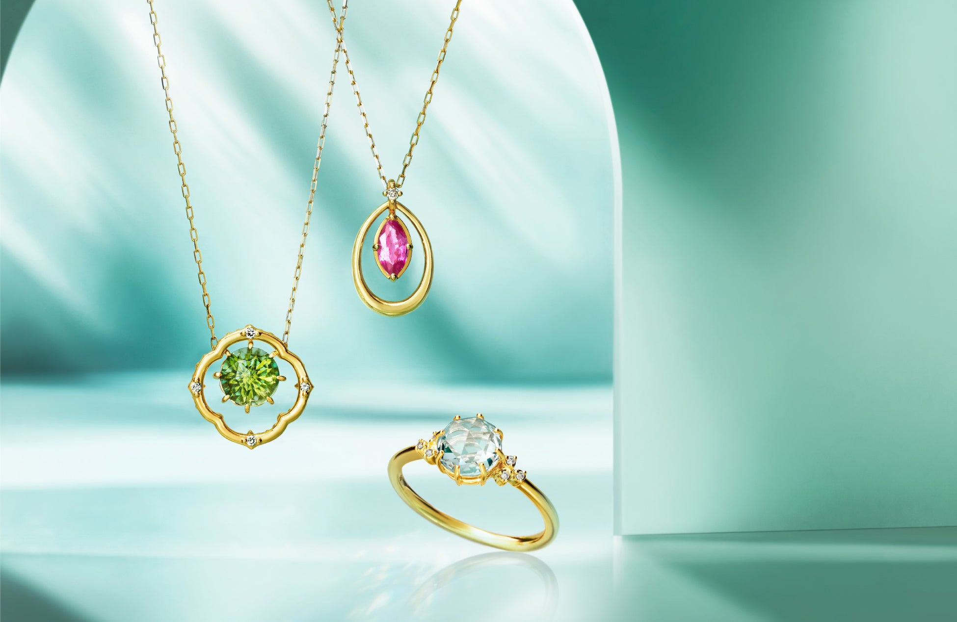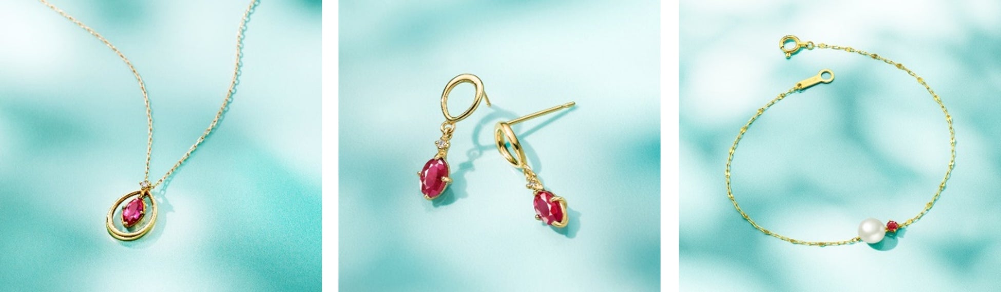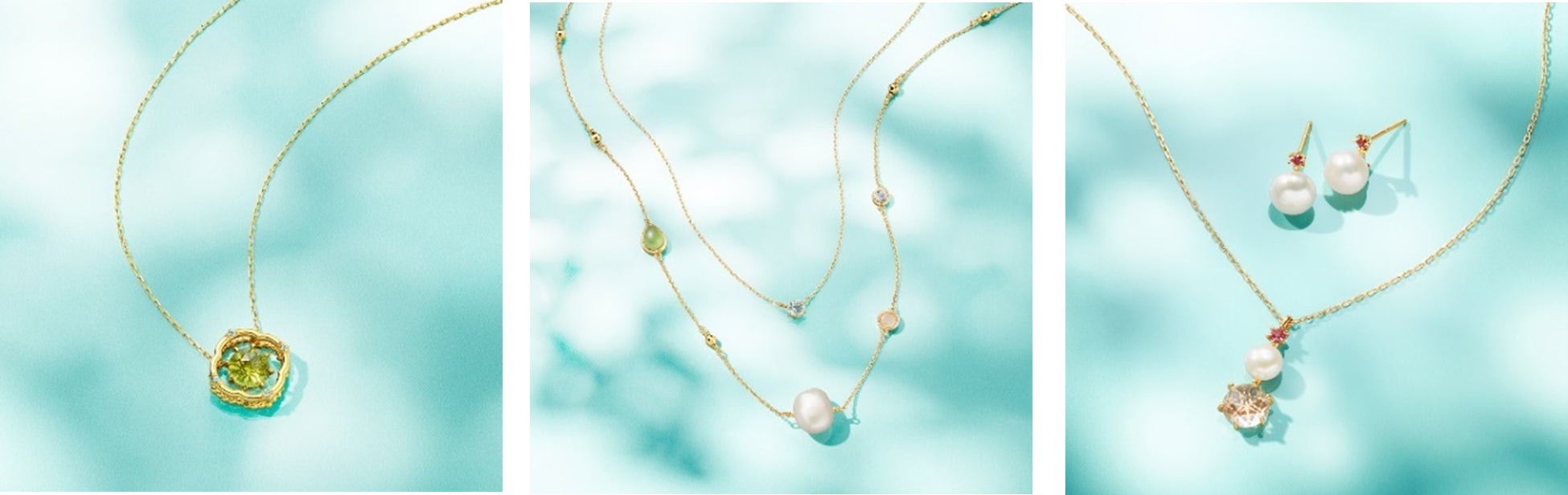この時期だからこそ楽しみたい鮮やかなカラーストーンのネックレスや、煌めくグリーンのワンポイントを添えるピアスとイヤーカフのセット、上品な輝きを放つパールと深みのある色彩が美しいルビーを施したブレスレットまで、身につけるひとの表情を柔らかくも凛と照らすアイテムが揃います。7月の誕生石であるルビー、8月のペリドットが輝くアイテムは、大切な方へのギフトにもおすすめです。
