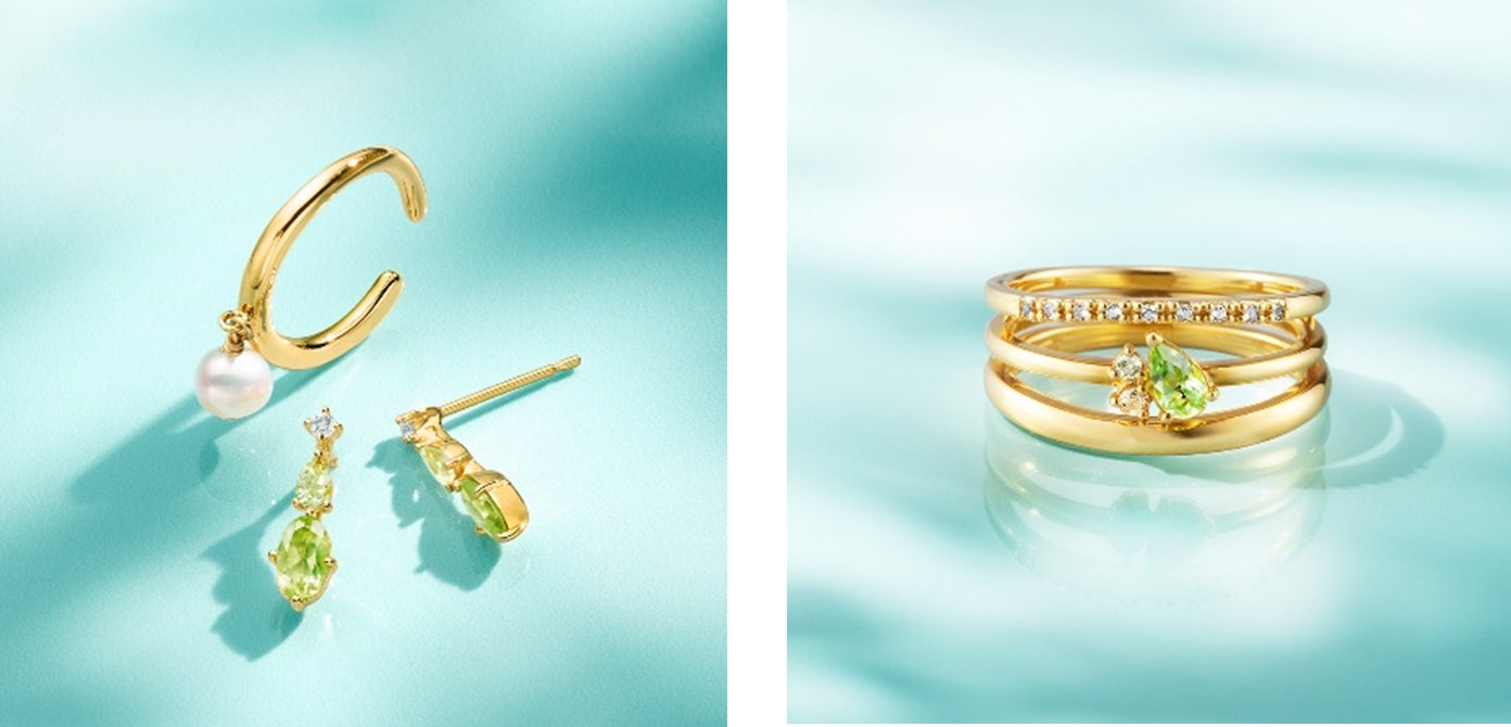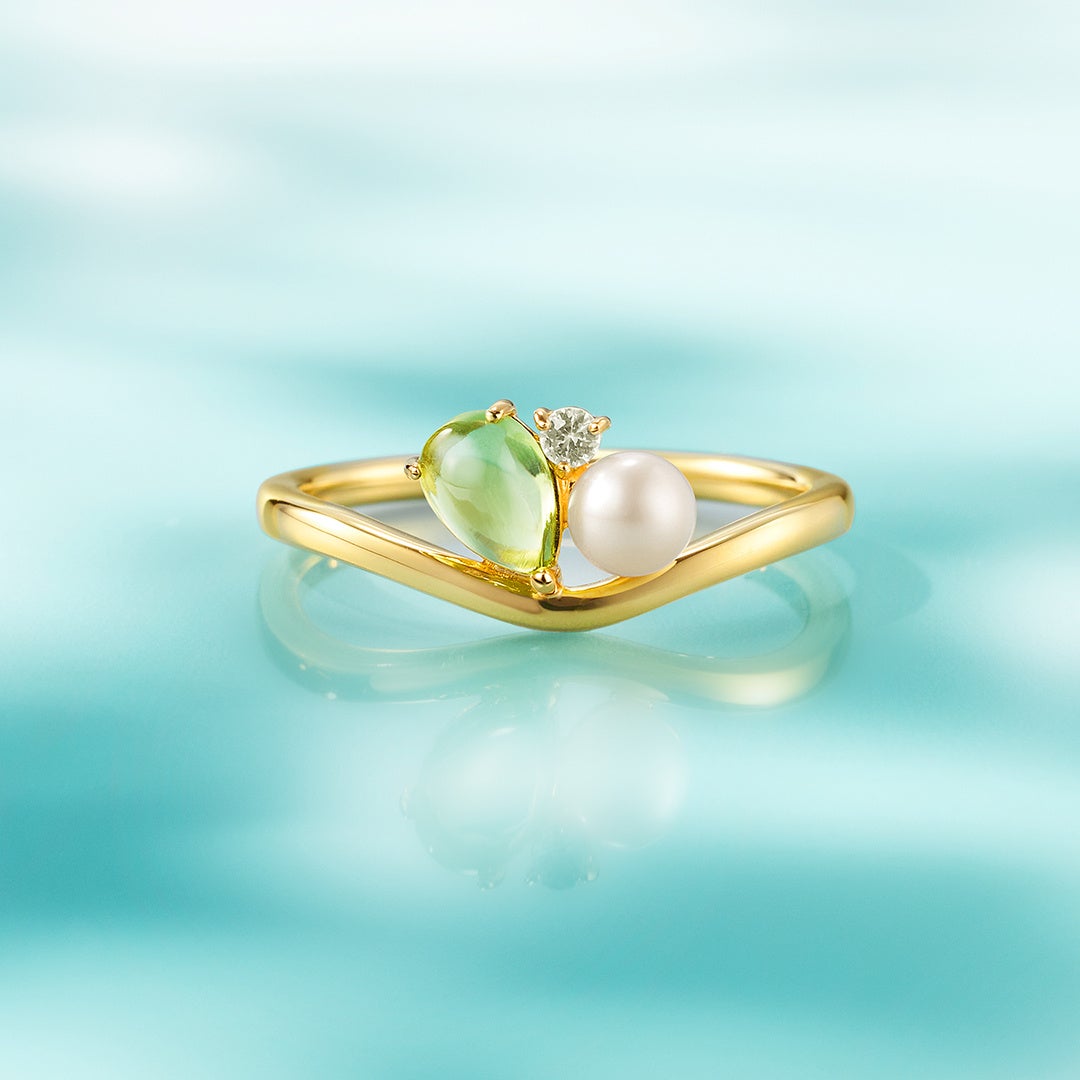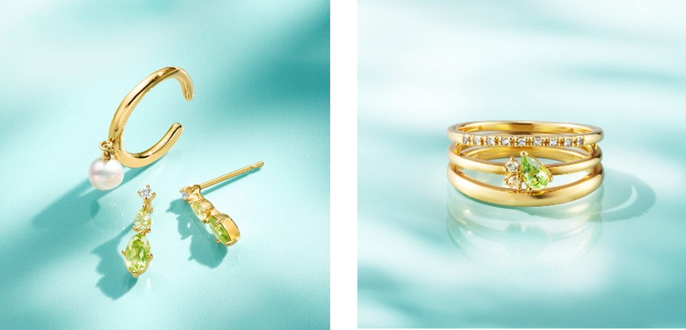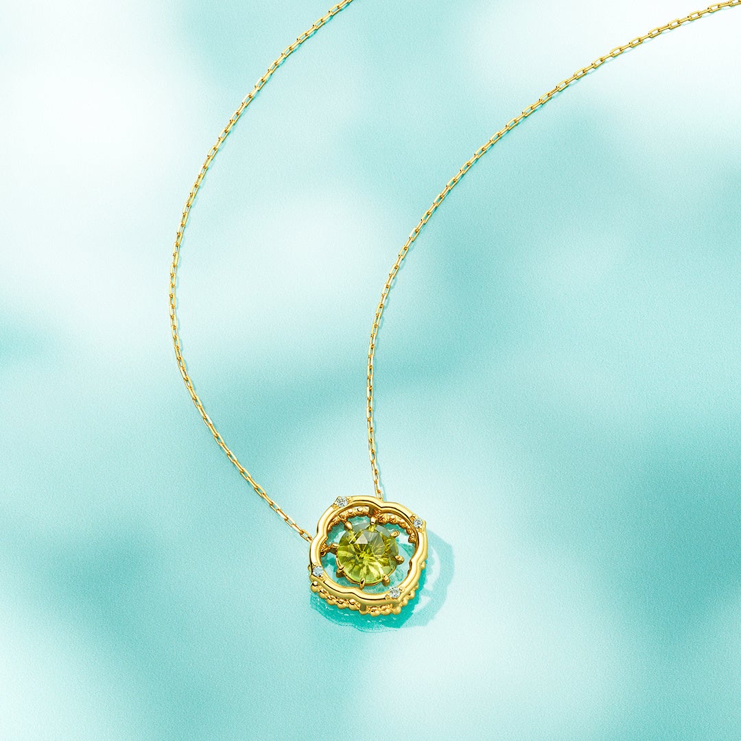 8月の誕生石であるグリーンのペリドットが立体的に煌めくジュエリーは、裏側にムーンストーンが施されたこだわりのデザイン。身に着けるたびに大人の愛らしさを宿します。