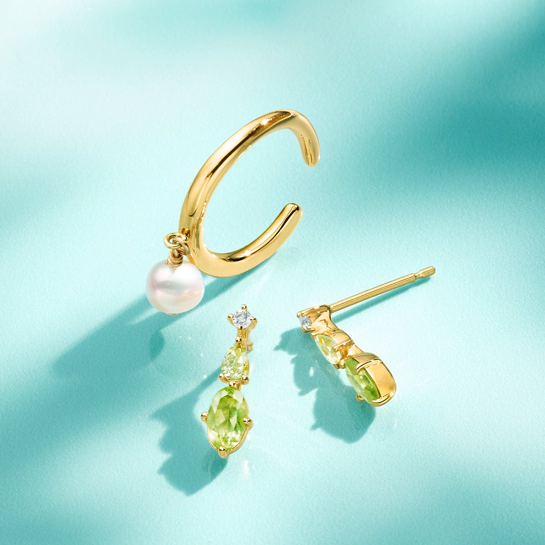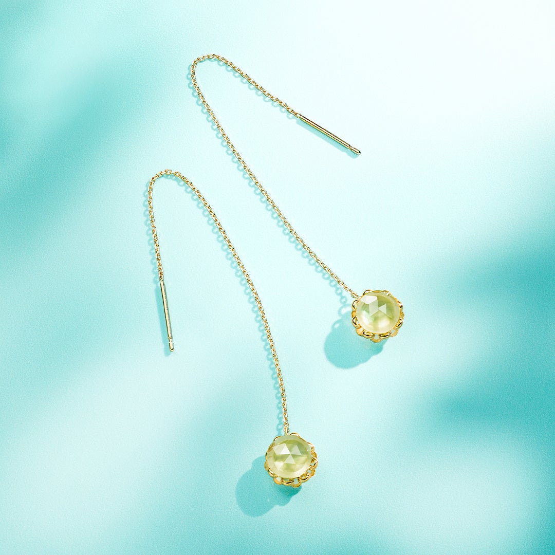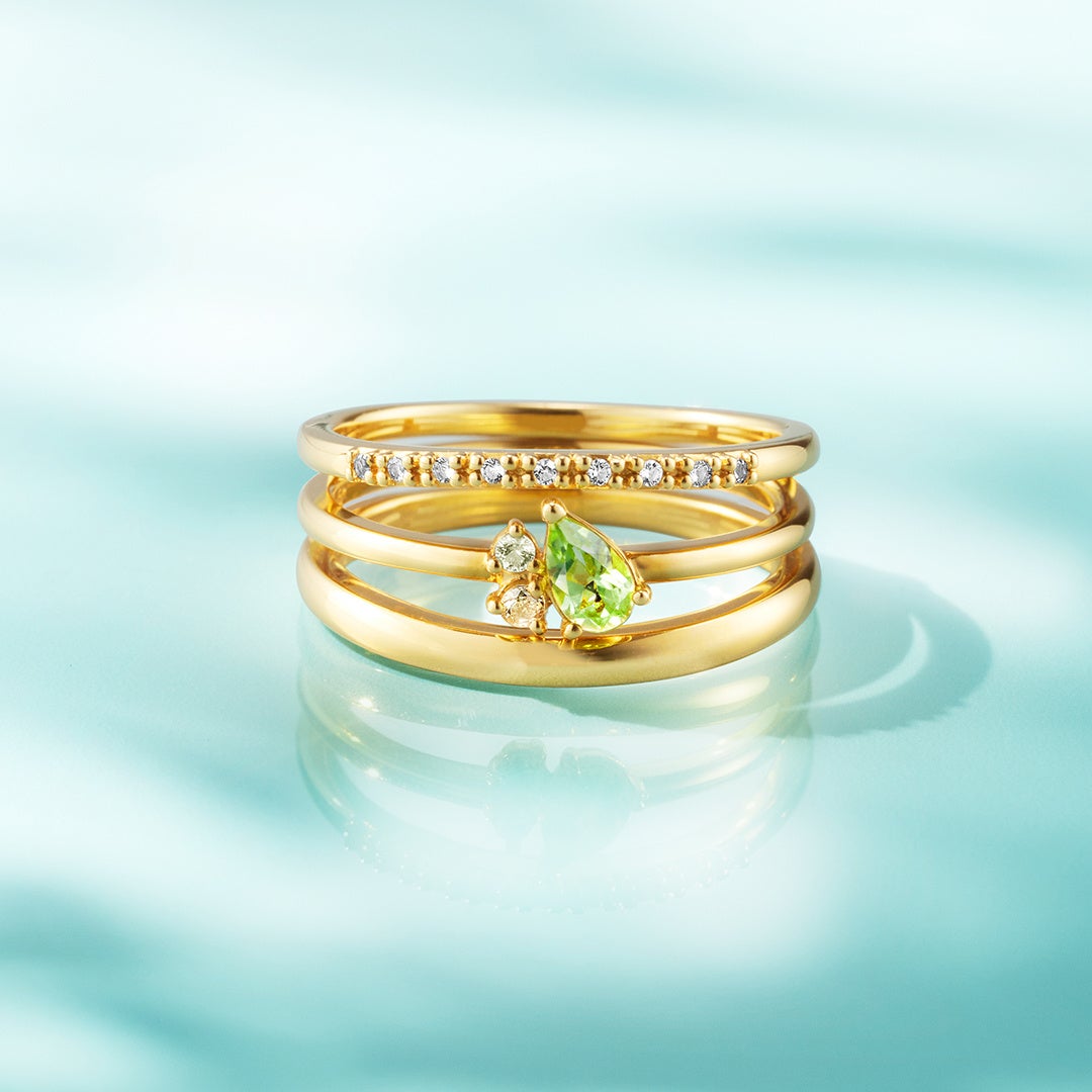 8月の誕生石であるグリーンのペリドットが立体的に煌めくジュエリーは、裏側にムーンストーンが施されたこだわりのデザイン。身に着けるたびに大人の愛らしさを宿します。