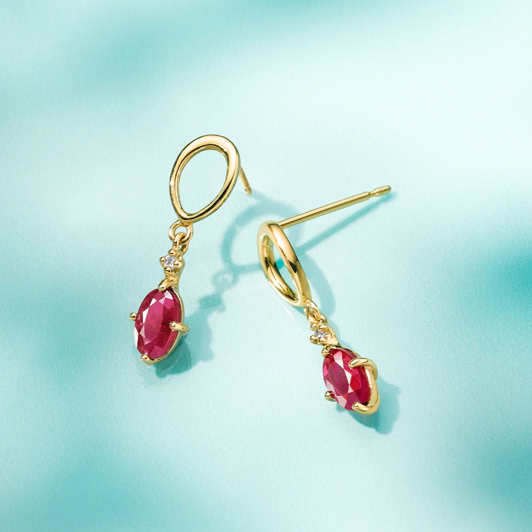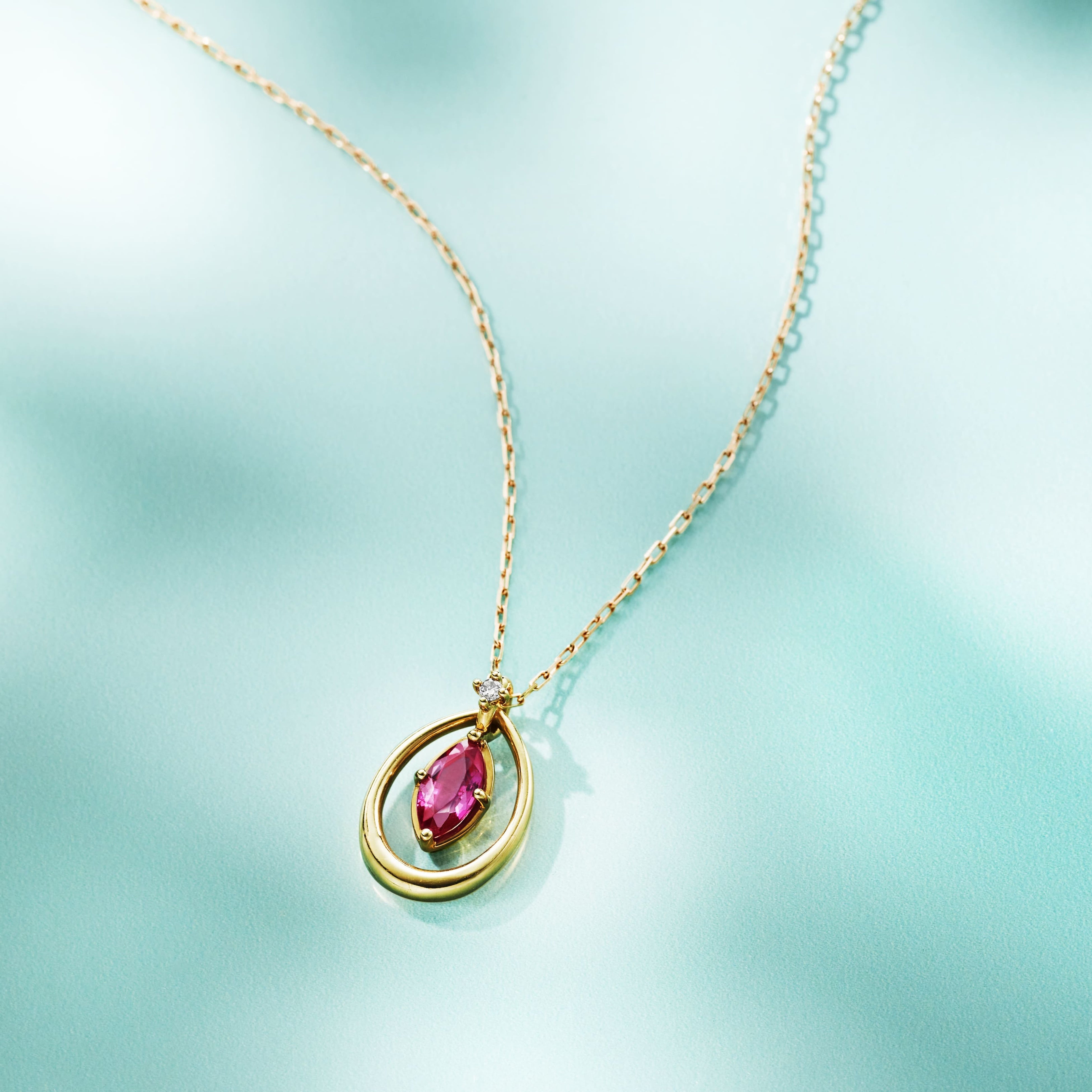 7月の誕生石であるルビーとイエローゴールドが夏の素肌に映えるジュエリー。ネックレスは、しずくモチーフの地金を逆さにしてチェーンを通せば、大胆に印象をかえる2WAY仕様。ルビーの鮮やかな輝きが揺れるデザインは、夏の装いに印象的なワンポイントを添えてくれます。
