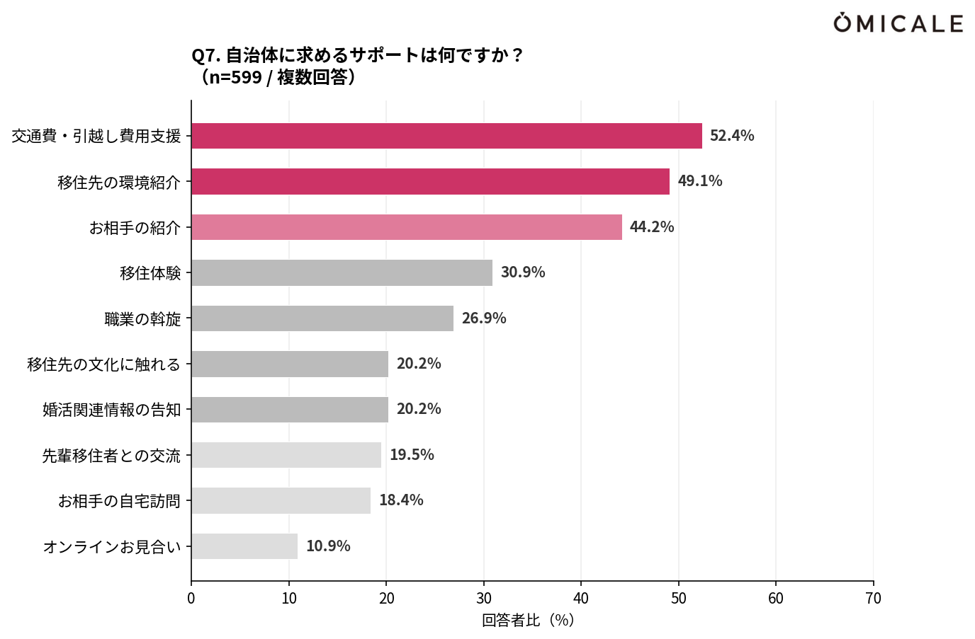 ▼ 自治体へのサポート要望トップは「交通費・引越し費用支援」(52.4%)。次いで「お相手の紹介」(44.2%)という結果に
