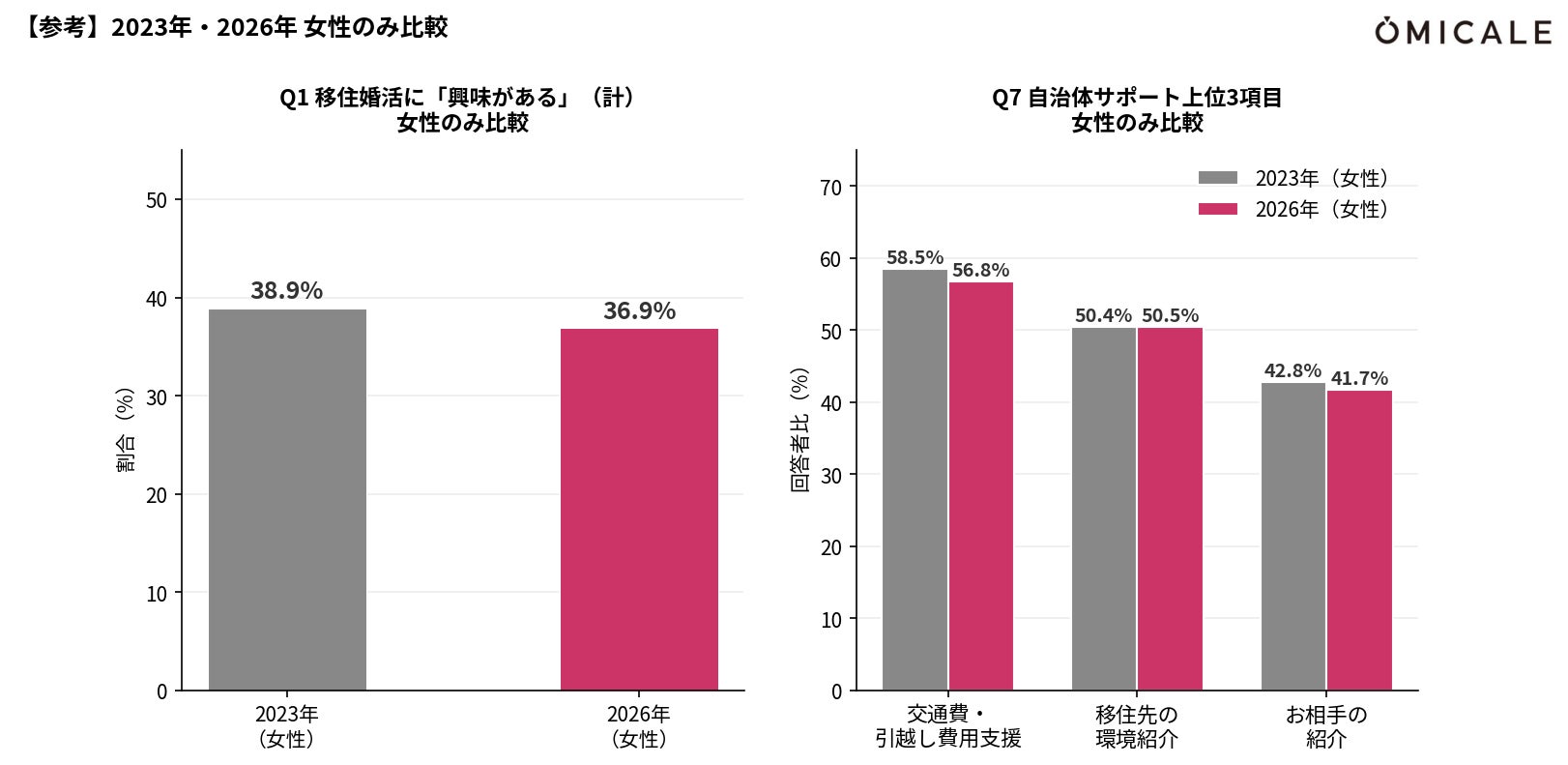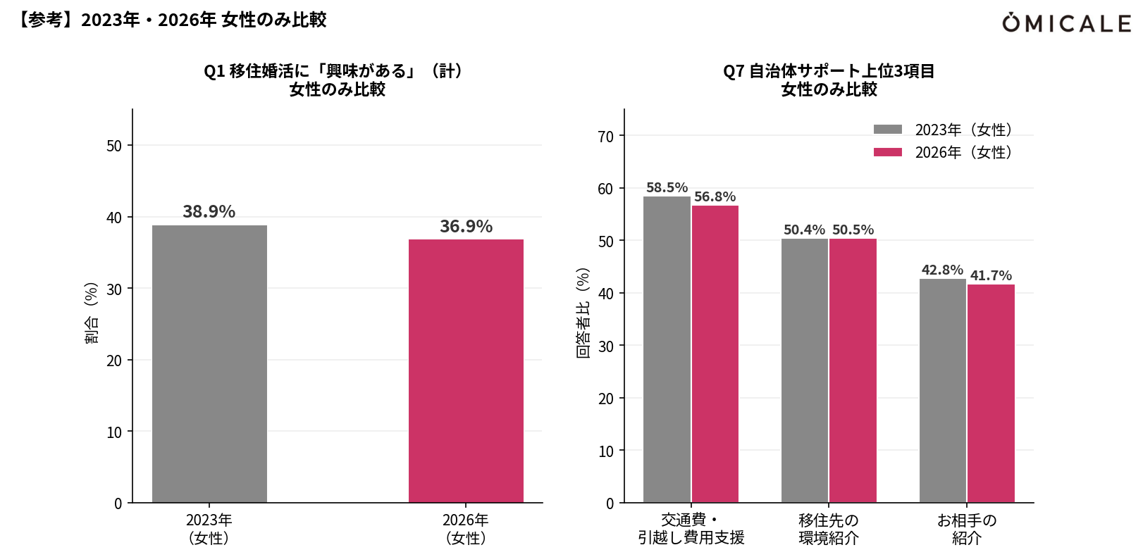 2023年から2026年にかけて、女性の移住婚活への意識に大きな変化は見られませんでした。「興味がある」割合・重視項目・自治体への要望ニーズともにほぼ同水準を維持しており、婚活女性の移住婚活に対する意識は安定していると言えます。