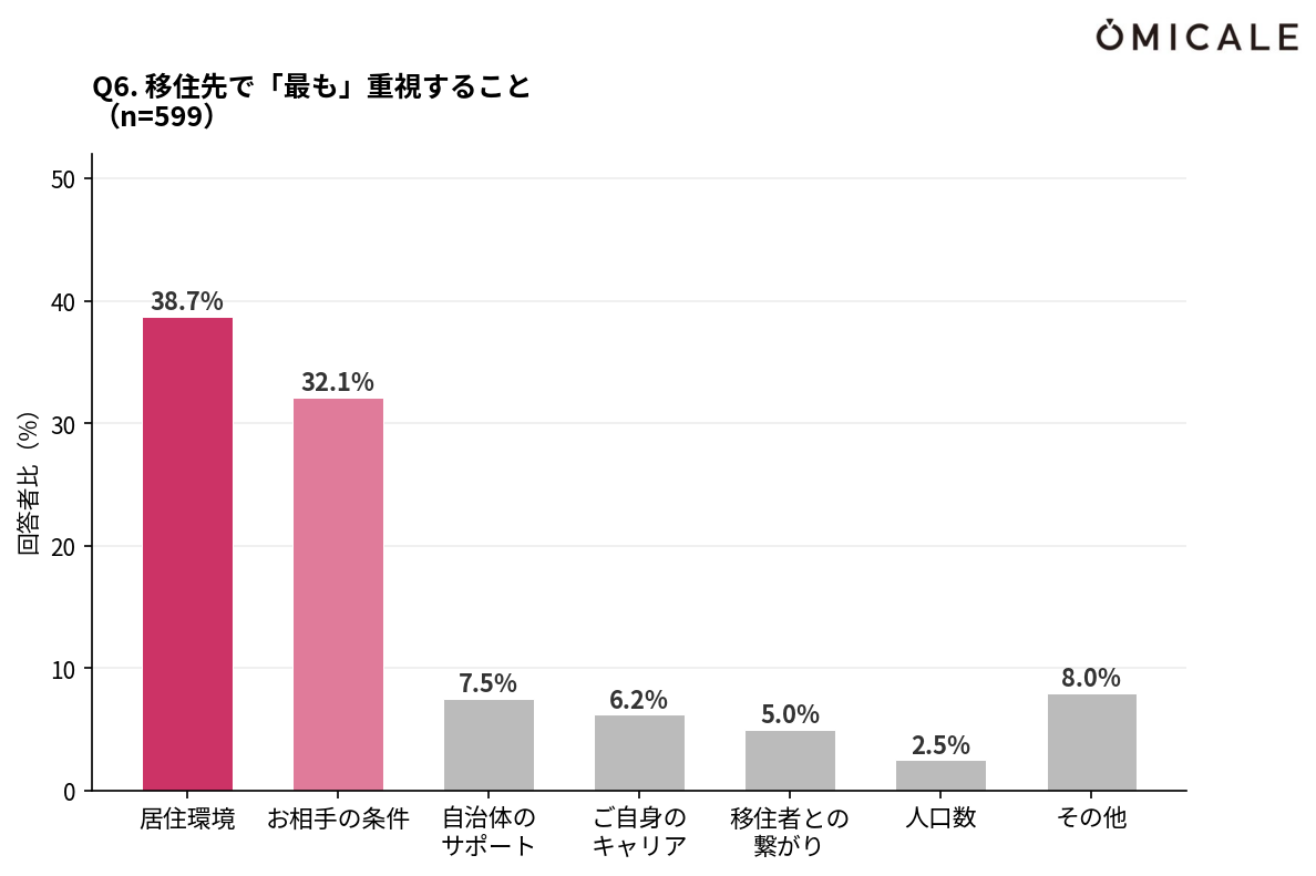 ▼ 移住先で最も重視するのは「居住環境」(38.7%)、次いで「お相手の条件」(32.1%)