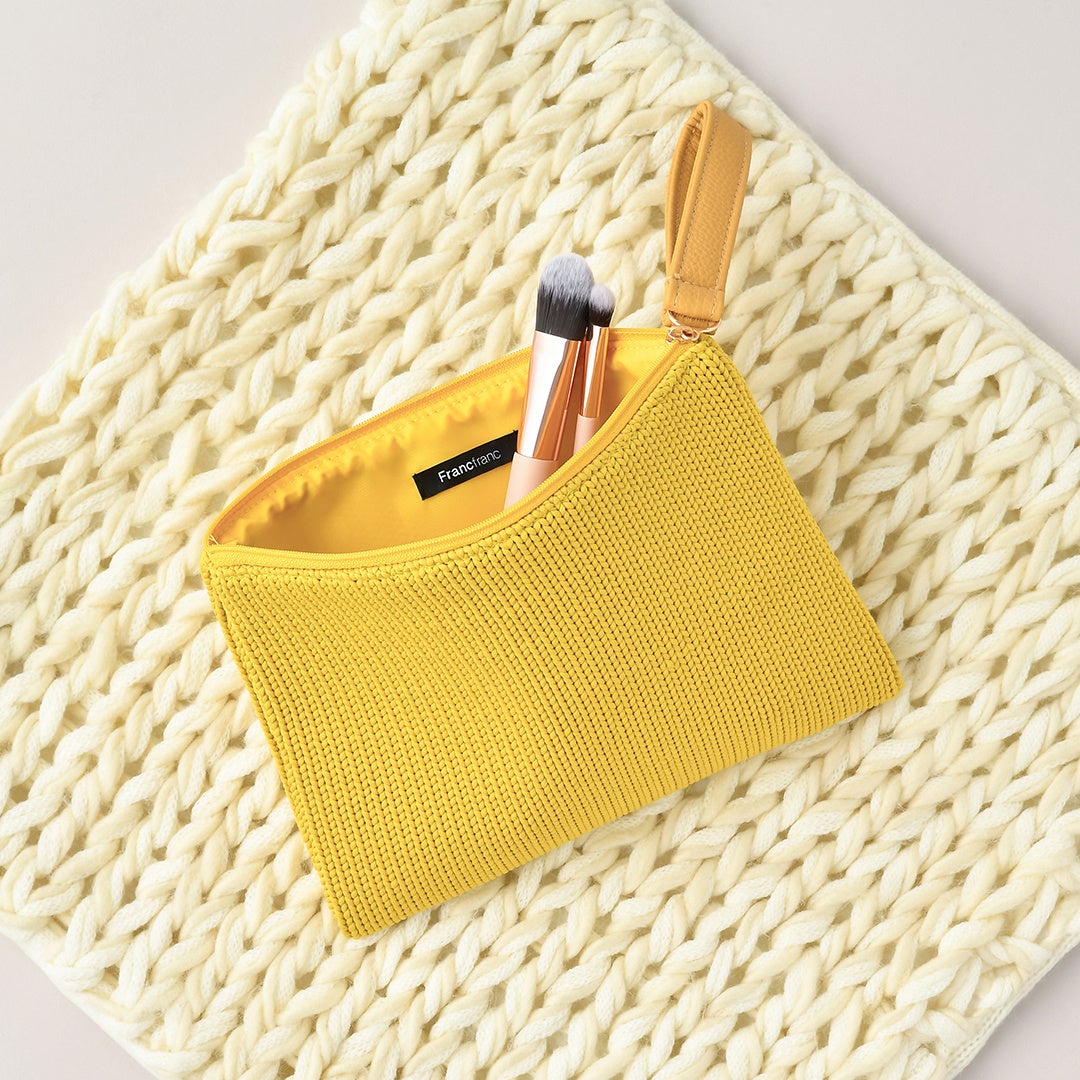 おでかけに持っていきたくなるパッと目をひく鮮やかなイエローのフラットポーチとナチュラルカラーがインテリアにも馴染みやすいバニティポーチは秋を先取りできるアイテムとして人気