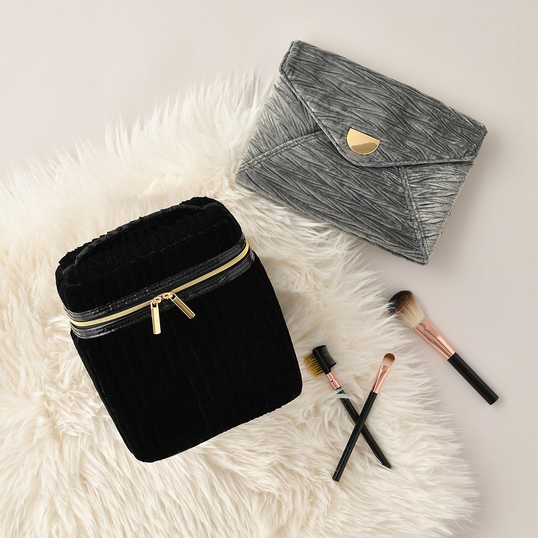 ベロア地にプリーツ加工を施したエレガントなデザインのフラットポーチとバニティポーチはシックな秋冬のスタイルにぴったり。どちらもゴールドがアクセントになっていて大人かわいい雰囲気が魅力
