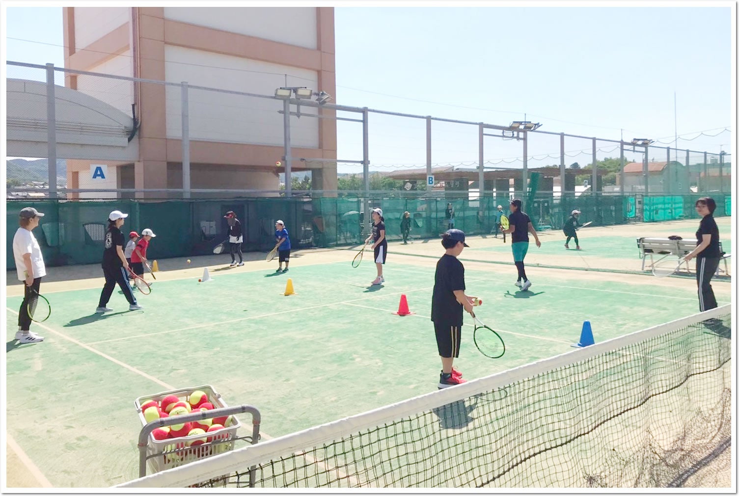 広くて安全なテニスコートで、親子でラリーや、コーチにチャレンジ!