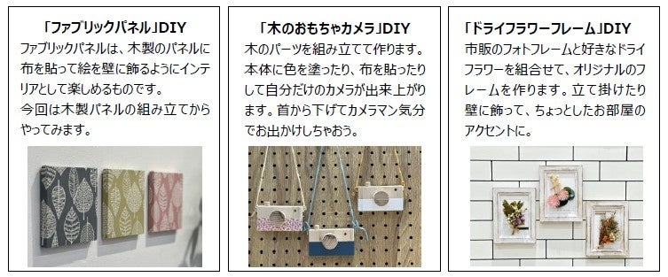 期間中、「DIY Work Studio」にて、ワークショップを無料でお楽しみ頂けます。毎回実施内容が異なり、各回定員8名1日4回開催いたします。お部屋の模様替えにも最適な“ファブリックパネル”をはじめ、端材を活用したお子さまと一緒に楽しめる“木のおもちゃカメラづくり”、お部屋のアクセントにもなる”ドライフラワーフレーム”など、未就学のお子さまでもできる手軽なDIY作品づくりをお楽しみ頂けます。