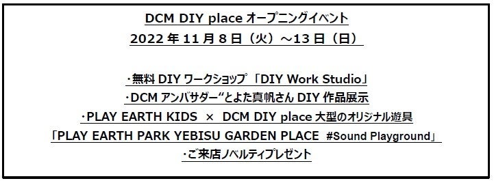 全国でホームセンター事業を展開するDCM株式会社(東京都品川区、代表取締役社長:石黒靖規、以下DCM)は、初の都市型新業態となる「DCM DIY place(以下、本店舗)」を11月8日(火)恵比寿ガーデンプレイスにオープンいたします。オープンを記念し11月8日(火)~13日(日)、無料で体験いただける日替わりDIYワークショップや、DCMアンバサダーのとよた真帆さんのDIY作品展示、ゴールドウイン“PLAY EARTH PARK”とのコラボレーションなど、オープニングイベントを開催いたします。