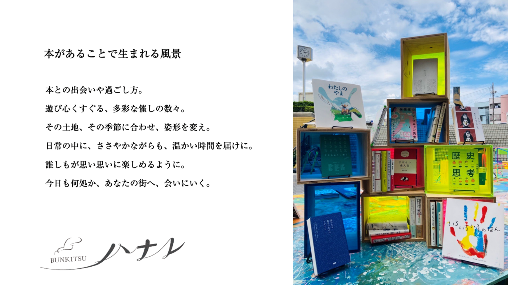 人文科学、自然科学、デザイン・アートまで約3万冊の書籍を揃え、本の価値を広げる「体験型本屋」として「偶然の出会い、一目惚れの瞬間、深みにはまる本との関係」をご提供してきた文喫が、この度店舗を飛び出し、本があることで生まれる風景をお届けする「文喫ハナレ」として皆さまの街へお伺いします。