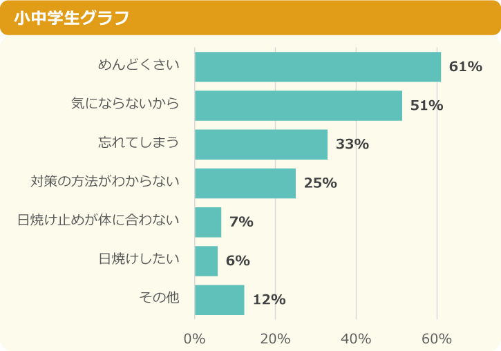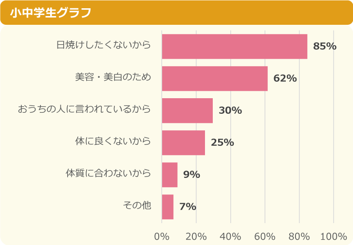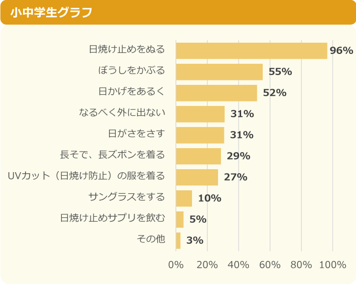 どんな日焼け対策をしているかという質問には、「日焼け止めを塗る」と答えた小中学生がほとんどで、100%に近い割合を占めました。日焼け対策をする時期は小学生と中学生で結果が異なり、小学生は「7月から」、中学生は「1年中している」が最多でした。