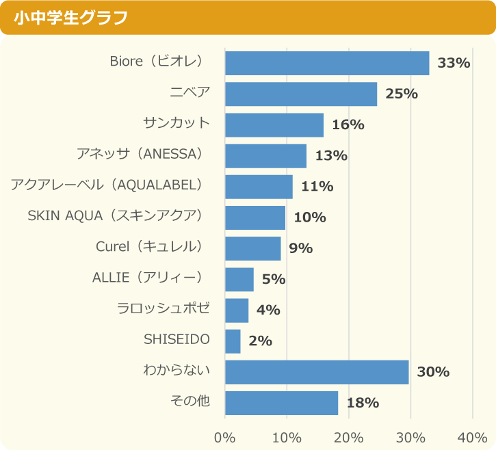 1番多く使われている日焼け止めは「Biore(ビオレ)」で、小中学生の33%でした。