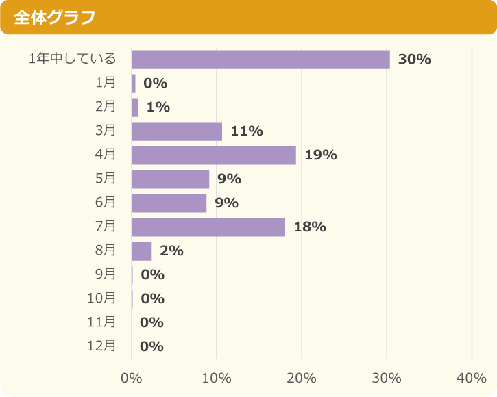 全体では「1年中している」という回答が最多で30%でした。「1年中している」人の割合は昨年の調査結果に比べて増えているようです。