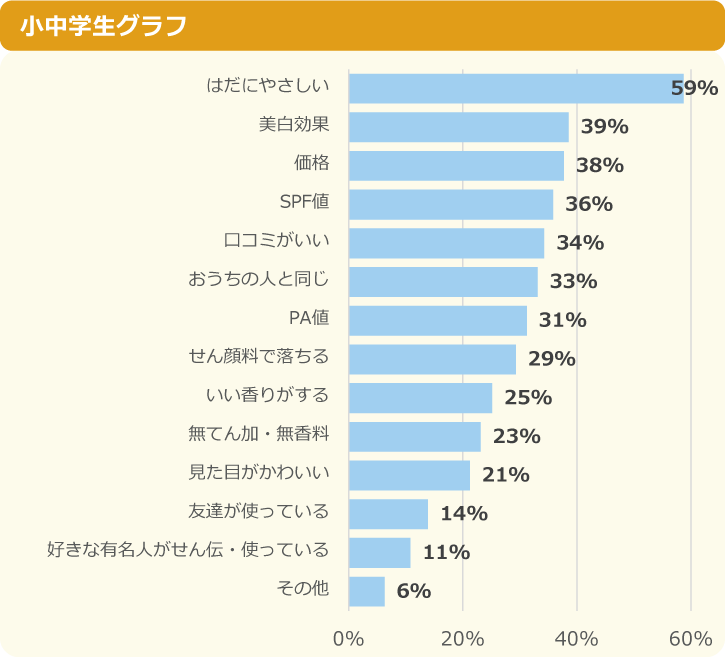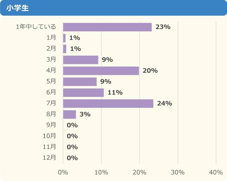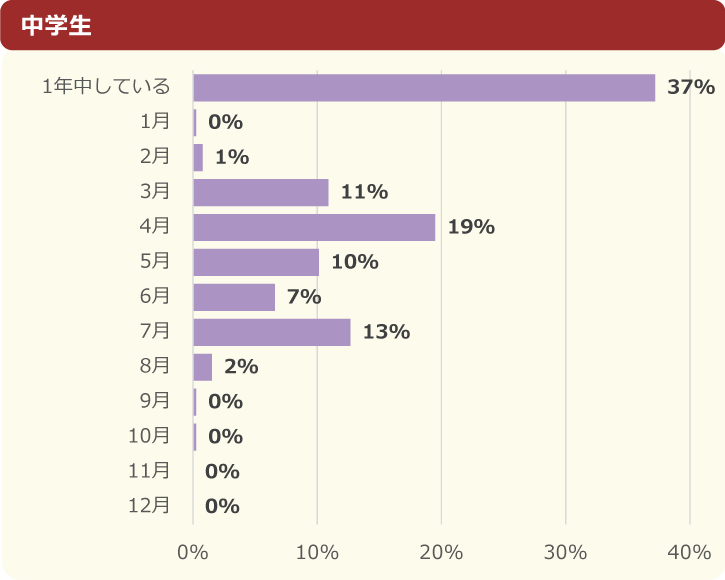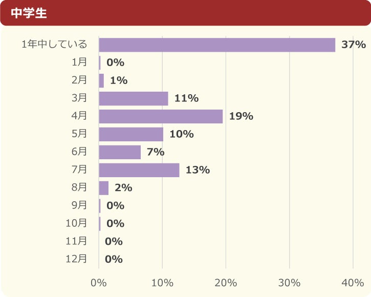 小中学生別に見ると、小学生は夏が始まる「7月」からという人が多かったですが、中学生は「1年中」の人が4割近くいて、中学生の方が日焼けに対する意識が高いことがわかりました。