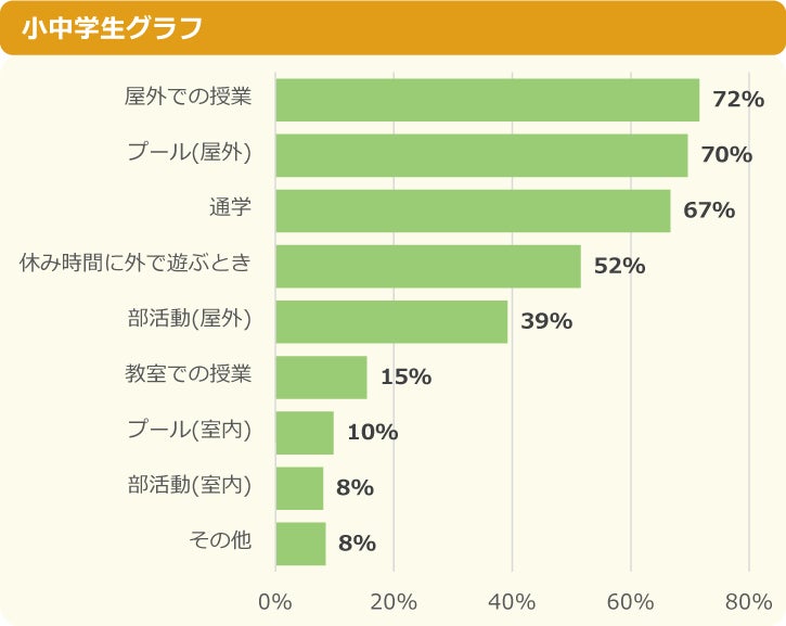 学校生活で日焼けが気になるシーンは「屋外での授業」「プール(屋外)」「通学」が全体の1~3位を占めました。