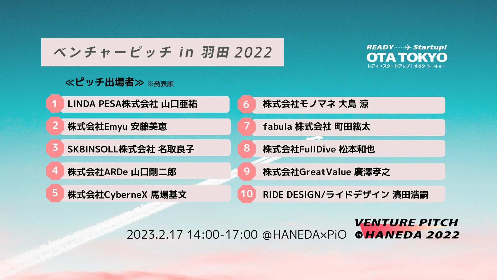 ピッチ出場者決定~投資機関・支援機関とのマッチングを目指す10名の起業家が「ベンチャーピッチ in羽田2022」へ出場~