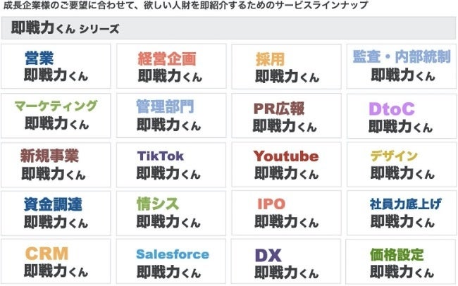 「即戦⼒くん」は、成⻑企業に、即戦⼒⼈材を即紹介をする、⼈材シェアリングサービスです。案件数は累計1,100件にのぼり、急成⻑企業様を中⼼にご利⽤いただいております。