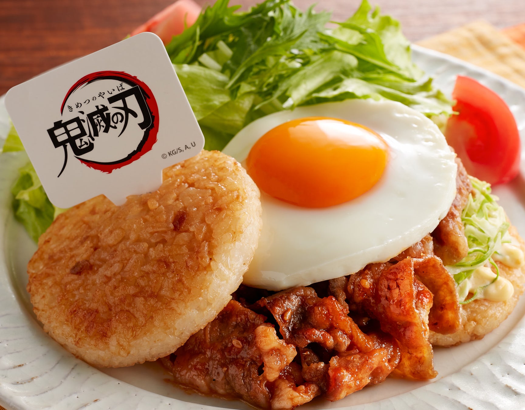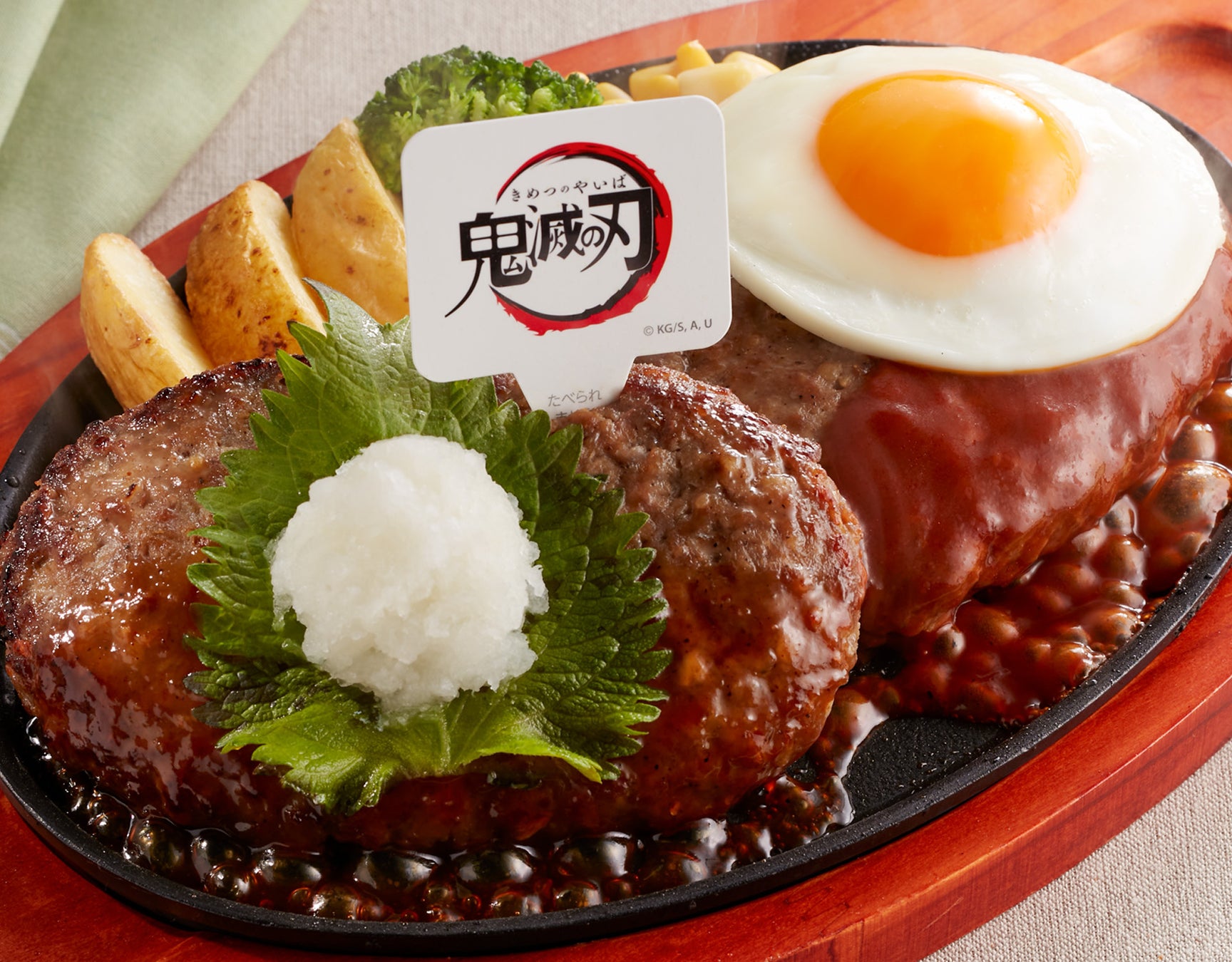 そんな主人公をイメージし、炭火焼きのタレを使用したジューシーなハンバーグに、市松模様の羽織の柄を表現した緑の大葉と黒い大根おろしをトッピング。日輪刀(ナイフ)をふるって鬼(海老フライ)の頸(くび)を斬ろう!