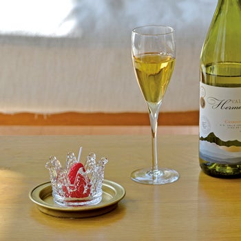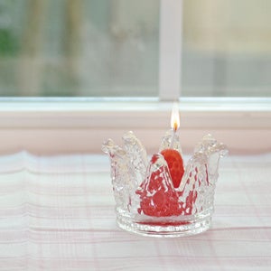 クラウン型キャンドルホルダーがセットになった、見た目も香りもいちごなキャンドル。いちごの香りに炎のゆらぎとガラスのきらめきであたたかな気分になります。
